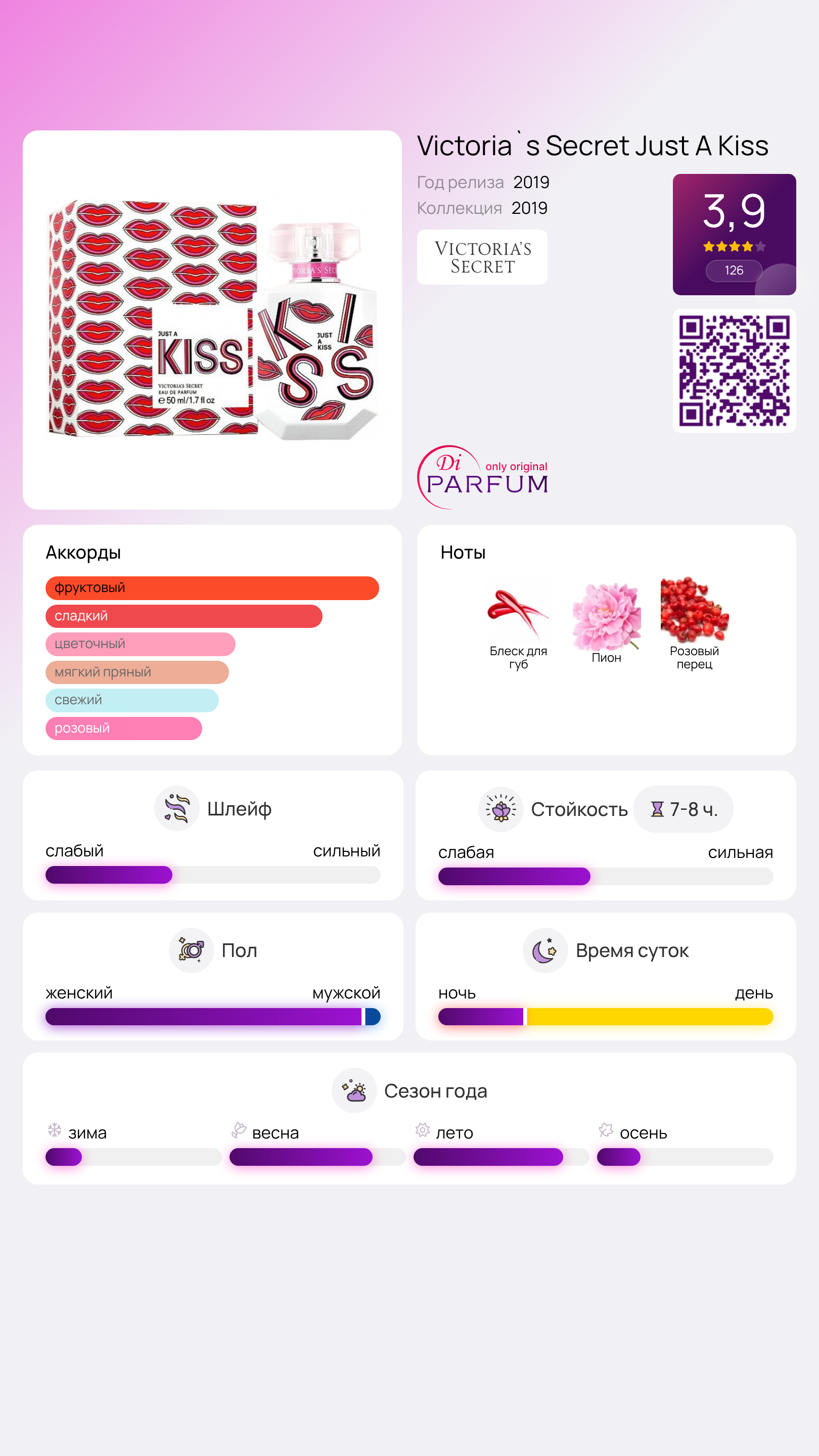 Кто, как ни творец великолепного нижнего белья марки Victoria's Secret, лучше всего понимает, что беспокоит мужчин и о чем мечтают женщины? Ароматы Victoria's Secret Just A Kiss тонко дополняют образ своей владелицы, становясь его незаметной частью и аккуратно подчеркивая то, что скрыто от глаз. Сексуальность проявляется, но далеко не на показ, эротика остается личной, а соблазн предназначен не для каждого.