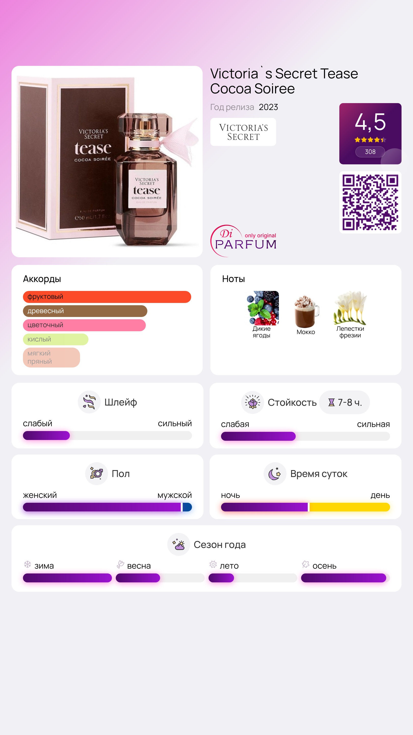 Парфюмерная композиция Victoria's Secret Tease Cocoa Soiree создана для искушенных ценителей и предлагает заглушить свои желания. Это восхитительный аромат соединяет свежие лесные ягоды с густым взбитым мокко. Он не просто парфюм, а настоящая гурманская фантазия. Ягодный букет включает в себя сочную малину и терпкую ежевику, создавая атмосферу очаровательной женственности.
