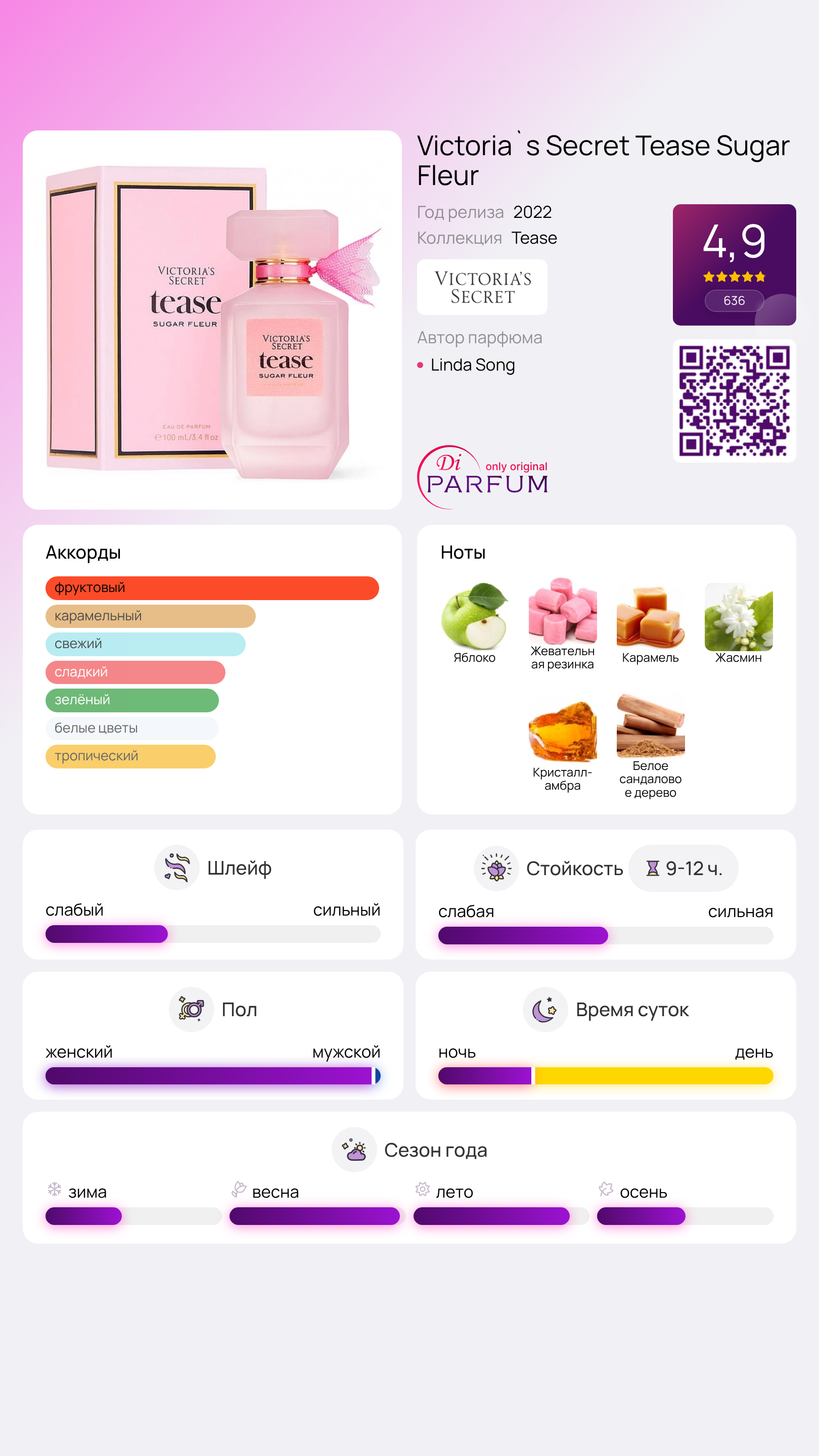 В верхних нотах вы ощутите освежающее яблоко и игривую жевательную резинку, которые наполнят вас энергией и хорошим настроением. Сердце аромата раскрывается нежным жасмином, добавляя утонченности и романтичности. Завершают композицию теплые ноты кристаллизованной амбры и сандала, придавая парфюму загадочную глубину и шлейф.
