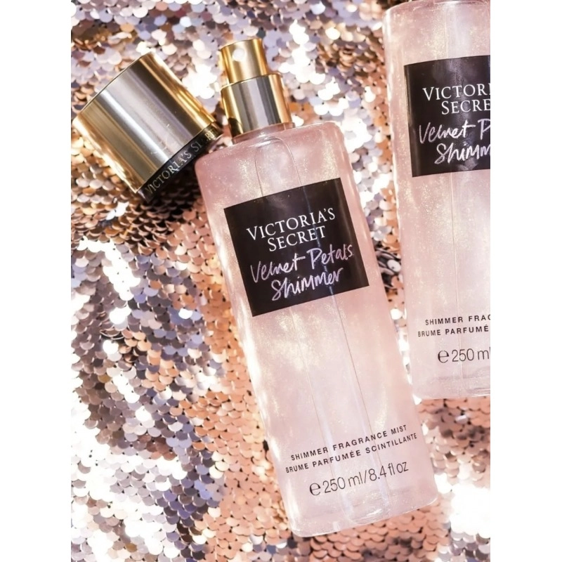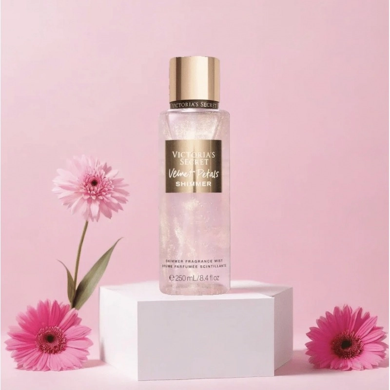 Парфюмированный мерцающий спрей-мист для тела Victoria`s Secret Velvet Petals Shimmer обеспечивает удивительный эффект перламутрового сияния и обладает великолепным ароматом. Его текстура напоминает жидкий розовый гель, в котором содержатся мельчайшие золотистые светоотражающие частички, создающие на коже влажное, мерцающее свечение.