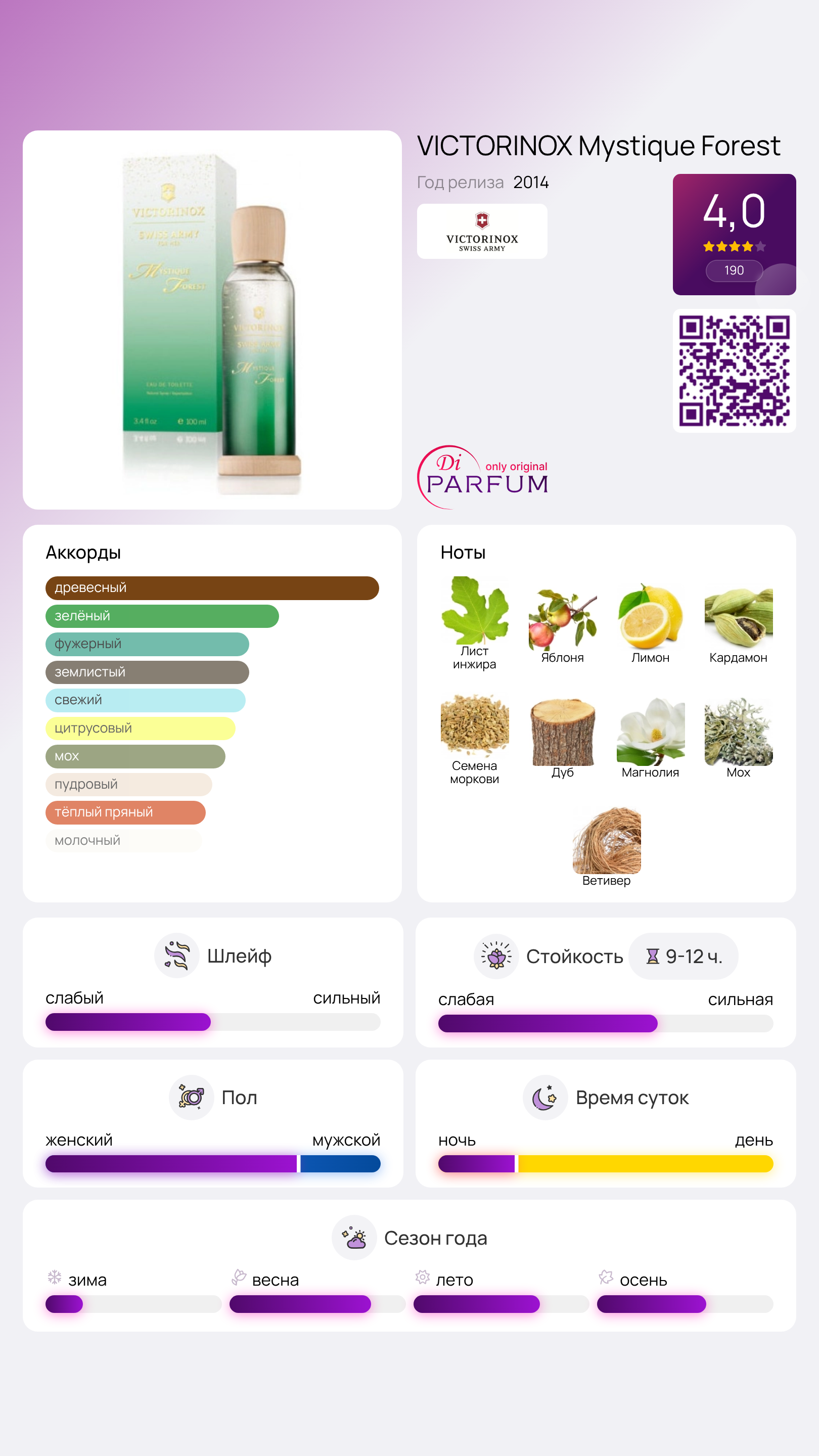 Парфюм Mystique Forest от Victorinox Swiss Army, выпущенный в 2014 году, позволяет ощутить это волшебство. Начальные ноты, такие как яблоня, лимон, кардамон и листья инжира, создают атмосферу лесной прогулки. Средние аккорды наполнены экзотической магнолией, семенами моркови и дубом, а в шлейфе уютно расположились мох и ветивер, образуя бархатную текстуру. Mystique Forest не только удивит своим неповторимым звучанием, но и порадует продолжительным шлейфом.