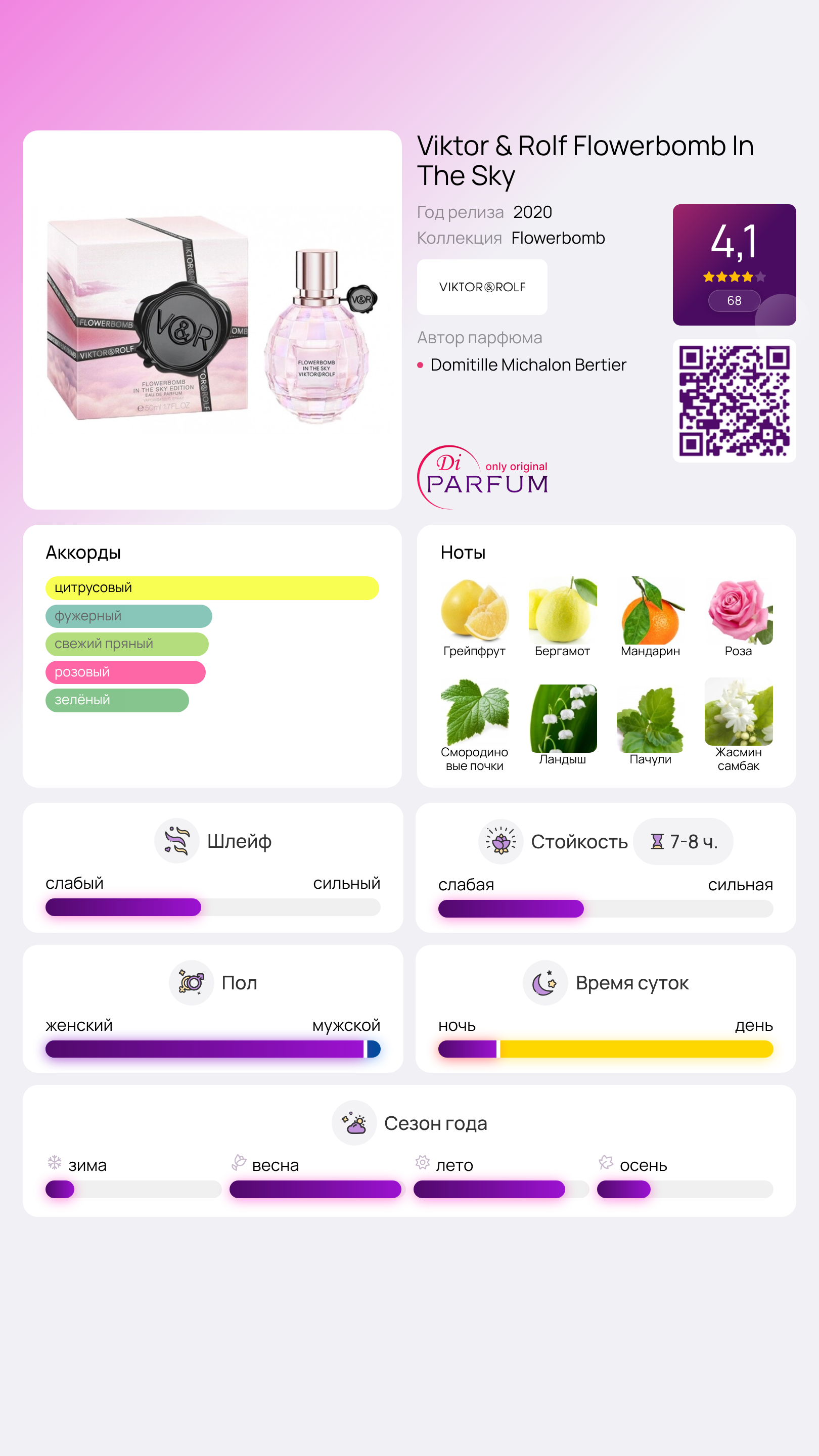 Легкое цветочное буйство немного припудрено, а база освежает заметным травяным экстрактом пачулей. Шлейф аромата остается с вами на протяжении всего дня. Уникальная композиция Flowerbomb In The Sky от Viktor & Rolf была добавлена к «взрывной» коллекции в 2020 году. Эта игривая и оригинальная композиция создает позитивное настроение и идеально подходит для повседневного использования. Духи ориентированы на современных мужчин и женщин, отдающих предпочтение сладковатым шипровым ароматам.