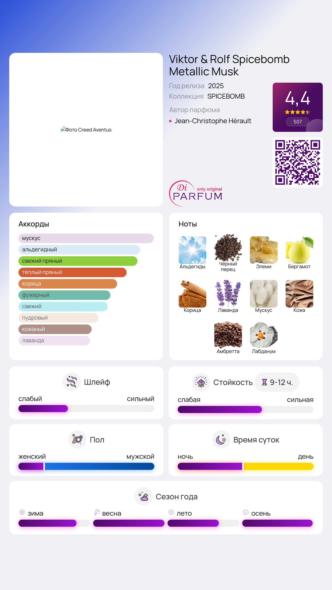 Семейство аромата: амберные. Верхние ноты: бергамот, черный перец, элеми, альдегиды. Ноты сердца: корица, перец, лаванда. Ноты базы: амбретта, лабданум, кожа, мускус.