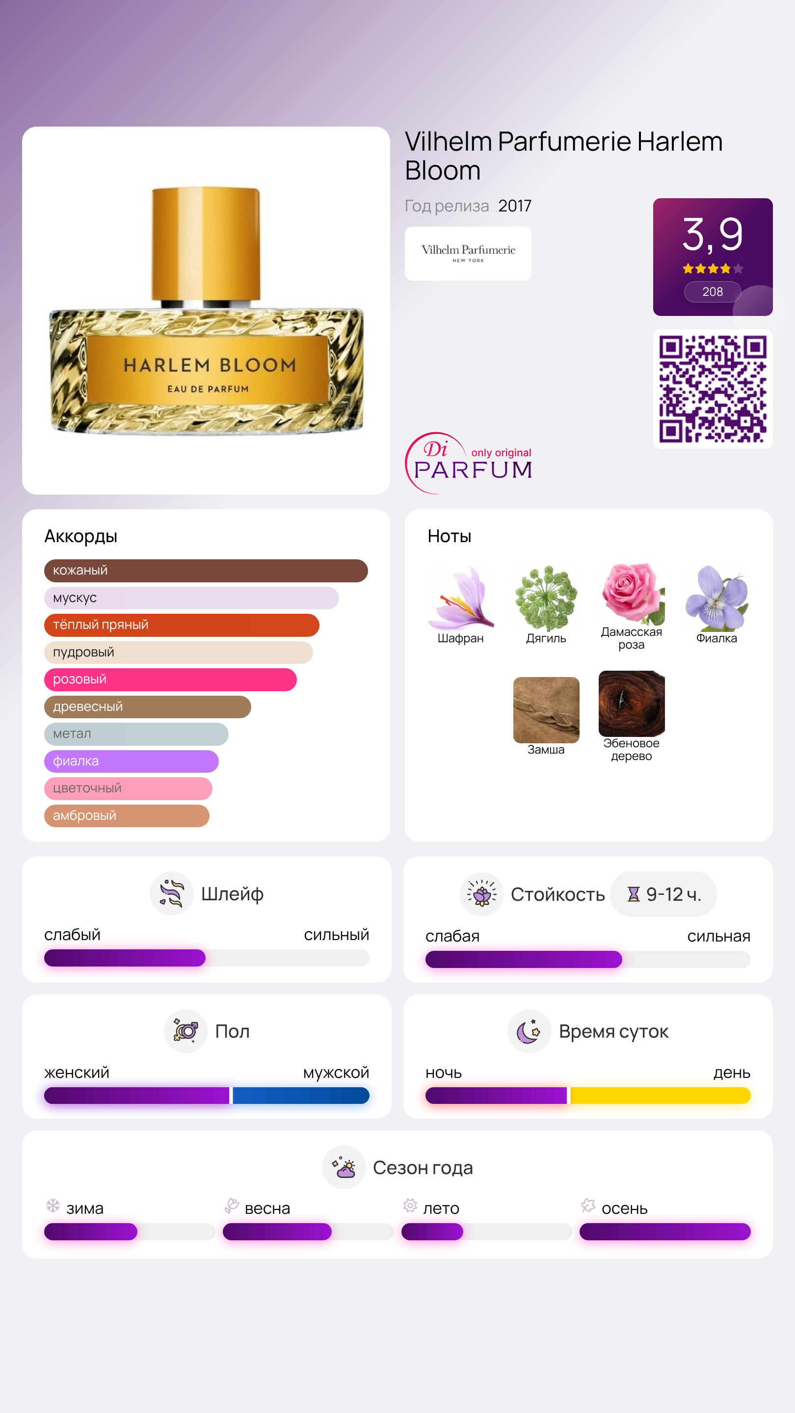 Цветущий Гарлем, которому посвящен этот аромат, отличается богатством и выразительным стилем, соответствующим духу района. Хотя Vilhelm Parfumerie Harlem Bloom классифицируется как восточный цветочный аромат, по своему звучанию он приближен к кожаной группе. В его основе лежит замша – мягкая и немного сладковатая нотка. Начальные аккорды раскрываются взаимодействием ангелики и шафрана, а сердце композиции заполняют фиалка и дамасская роза. Завершающая часть представляет собой оригинальное сочетание замши с эбеновым деревом.