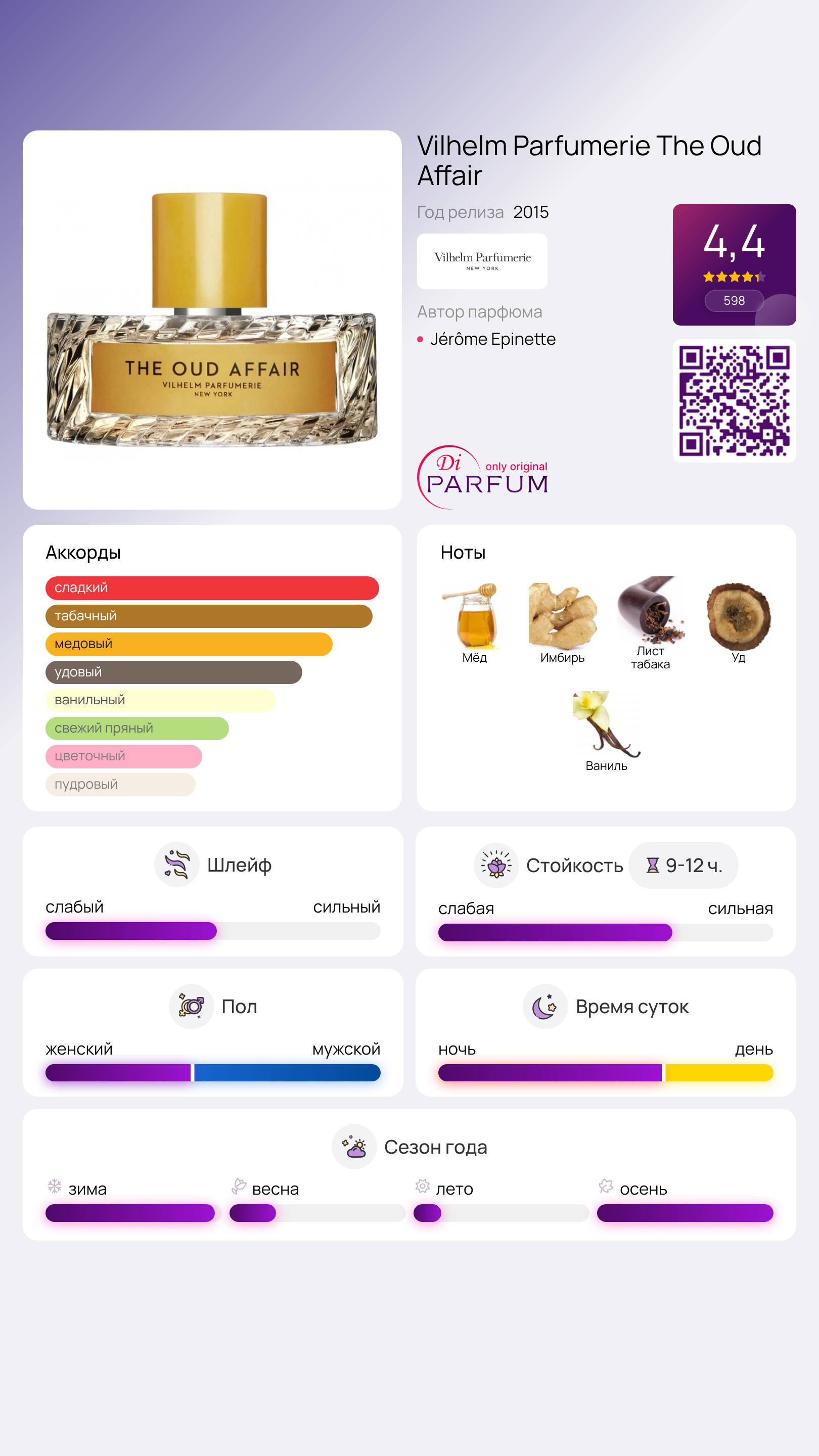 The Oud Affair от Vilhelm Parfumerie — это восточно-древесный аромат, подходящий как для женщин, так и для мужчин. Выпущенный в 2015 году, этот парфюм стал настоящим произведением искусства благодаря таланту парфюмера Jérôme Epinette. Верхние ноты меда и имбиря создают яркое и сладкое начало, переходящее в насыщенную среднюю ноту табачного листа, которая придаёт аромату характер и глубину. Завершающие ноты агарового дерева (уд) и черной ванильной бобы дарят ощущение тепла и страсти.