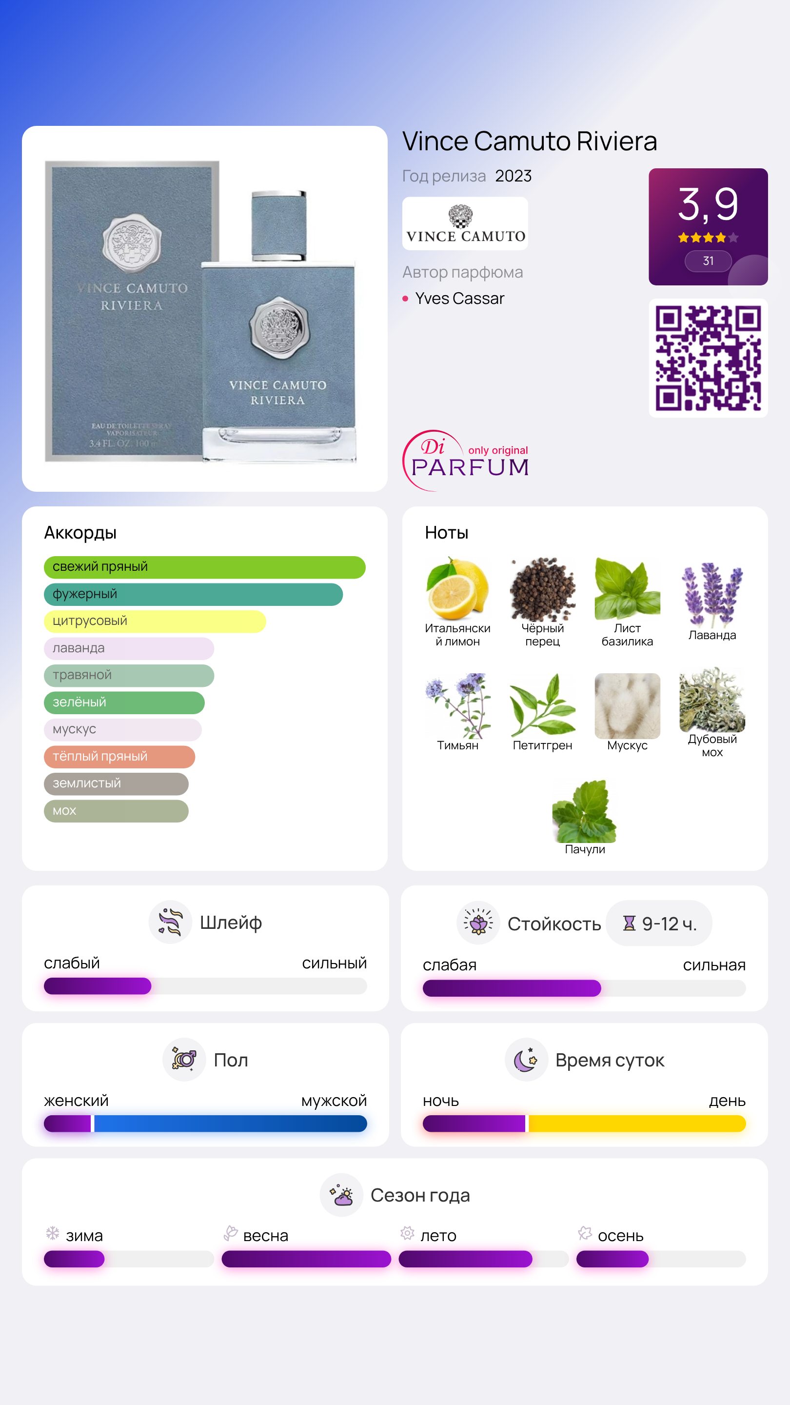 Vince Camuto Riviera - это яркий и живой аромат для мужчин, который в полной мере передает элегантность и динамику средиземноморского стиля жизни. Он символизирует свежесть и хорошее чувство стиля, создавая образ современного, уверенного в себе человека, который стремится к новым достижениям.