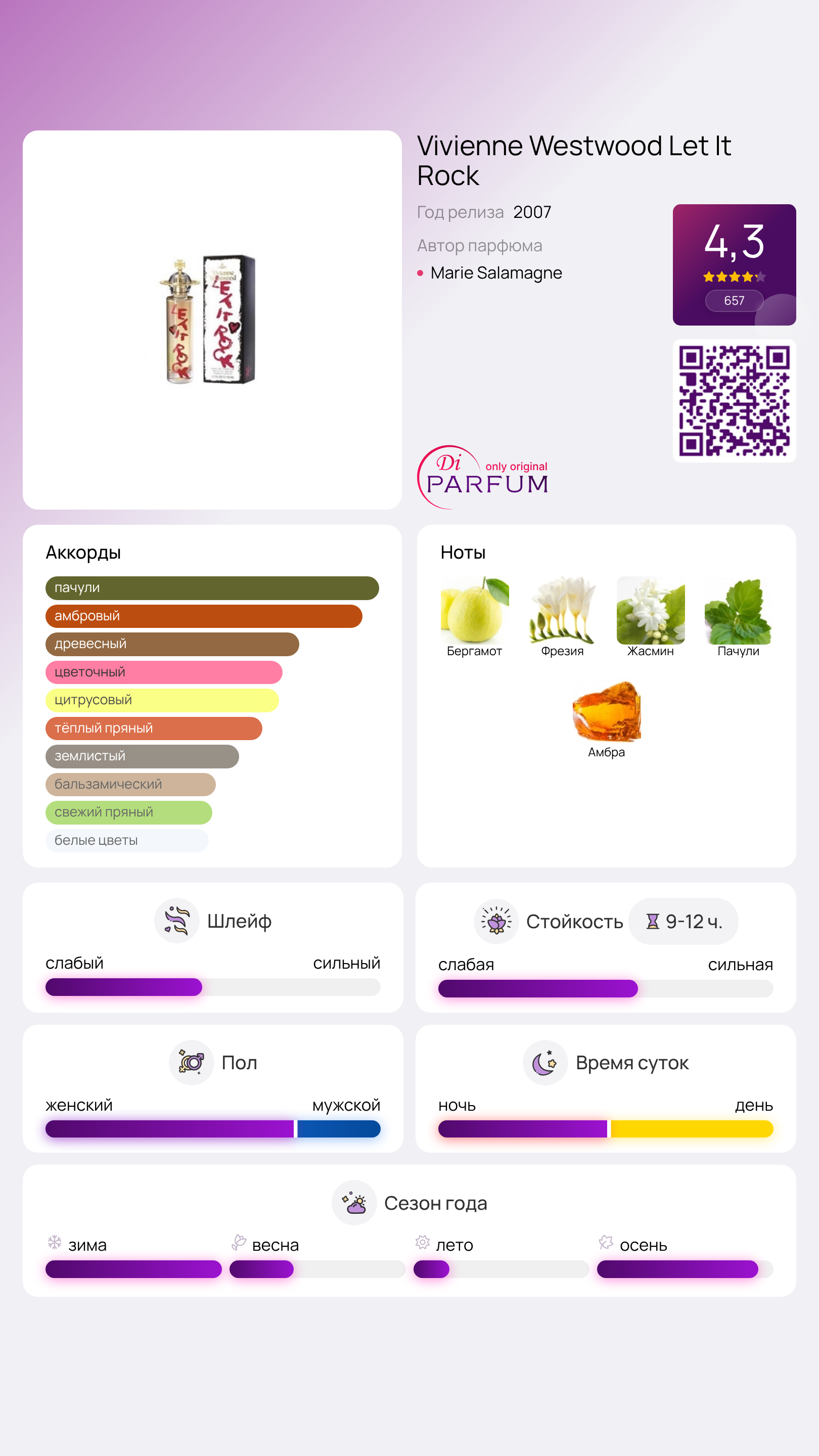 Аромат формирует уникальную атмосферу, подчёркивая индивидуальность обладательницы. Он способен адаптироваться к её настроению и рассказать уникальную историю. Легкие ноты жасмина, фрезии, бергамота и амбры вызывают ассоциации с атмосферой 70-х годов. Возможно, именно ностальгия по ушедшим временам вдохновила мастера на создание этого великолепного аромата Let It Rock.