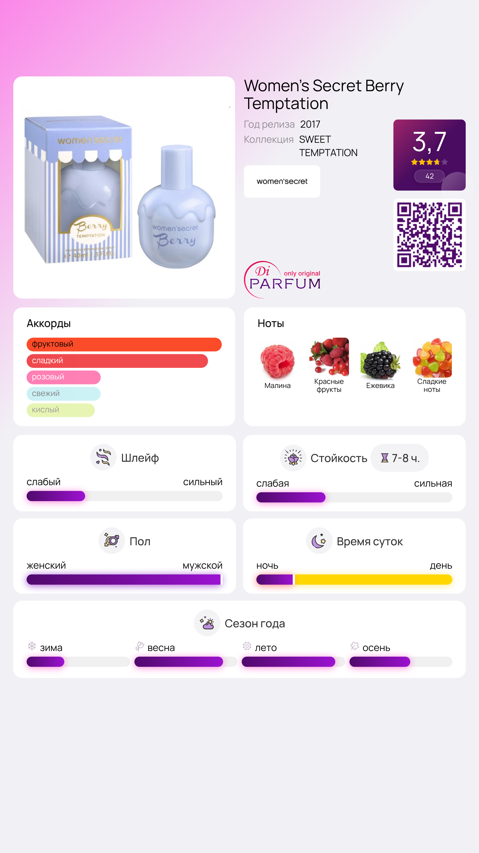 Аромат получился цветочно-фруктовым и носит название, которое в переводе означает «Ягодное искушение». В его верхних нотах вас встретит яркий букет из свежих, сочных ягод, включая терпкую черную смородину, сладкую клубнику и тропическое личи, легкий запах которого напоминает розы.