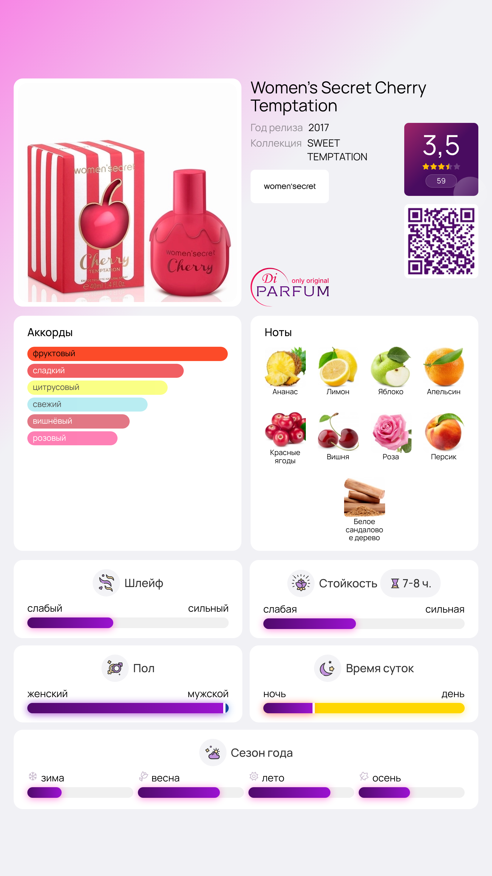 Cherry Temptation относится к категории фруктово-фужерных ароматов, где сладость фруктов изящно переплетается с травянистыми нотами. Этот легкий и воздушный парфюм поднимает настроение, воскрешает приятные воспоминания и придает загадочность своей обладательнице.