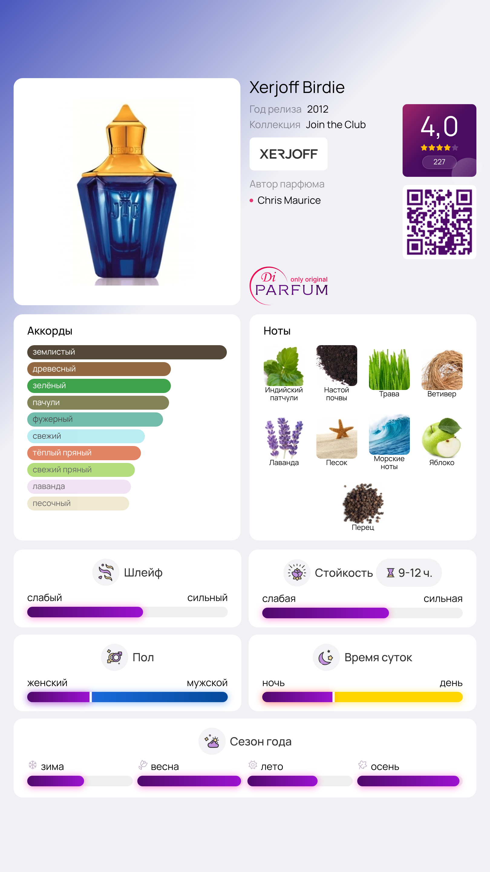 Флаконы ароматов выполнены из подлинного голубого стекла, которое отличается редкостью и ограниченным производством, что придает каждому изделию особую ценность. Birdie сочетает ноты зеленого яблока, лаванды, перца, трав, морских акцентов, песка, почвы и ветивера, создавая уникальную гармонию свежести и землистости, что делает его идеальным выбором для настоящих ценителей парфюмерного искусства.