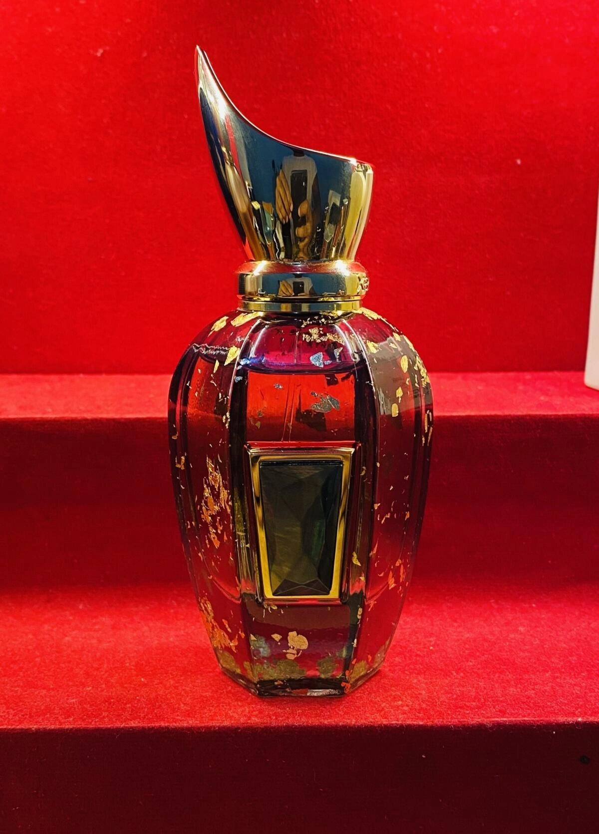 Люксозный флакон, украшенный колпачком, стилизованным под корону фараона, напоминает полированный мрамор с золотыми прожилками.