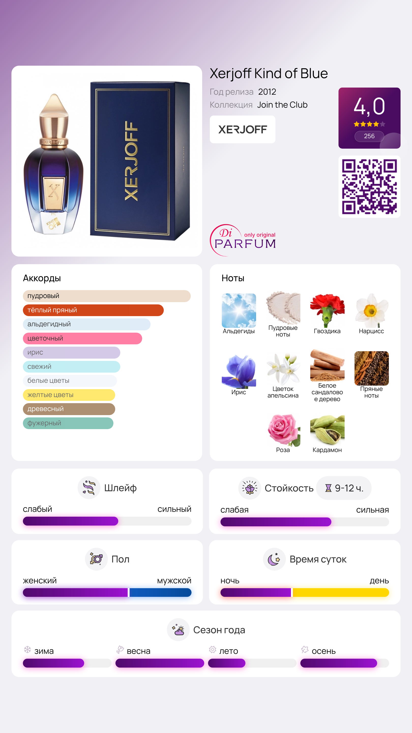 Аромат Kind of Blue от итальянского бренда Xerjoff обладает потрясающей силой и выглядит поистине чарующе благодаря своему составу, объединяющему цветочные и древесные ноты. Пирамида аромата открывается лёгкими оттенками флердоранжа, динамичностью альдегидов и пряными нюансами специй, плавно переходя к цветочному сердцу с яркими акцентами кардамона и пудровых элементов.