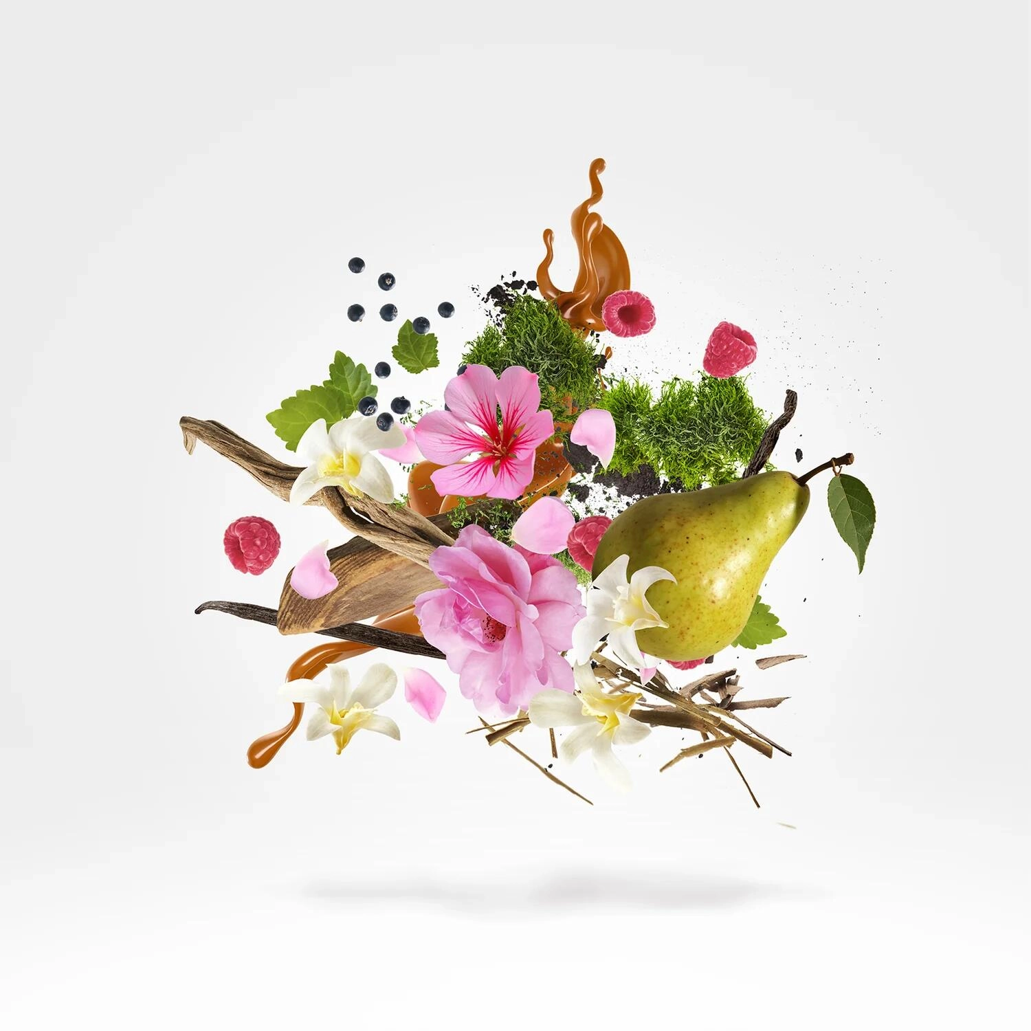 В верхних нотах аромата свежая черная смородина, спелая малина и сочная груша создают яркое и манящее начало, которое приглушает страсть к сладким фруктам. Сердце аромата раскрывается изысканной дамасской розой, нежной сливой, древесным кедром и свежей герани, что придаёт композиции элегантность и глубину. Базовые ноты амириса, мускуса и ванили завершают этот великолепный шедевр, оставляя после себя мягкий и теплый след.