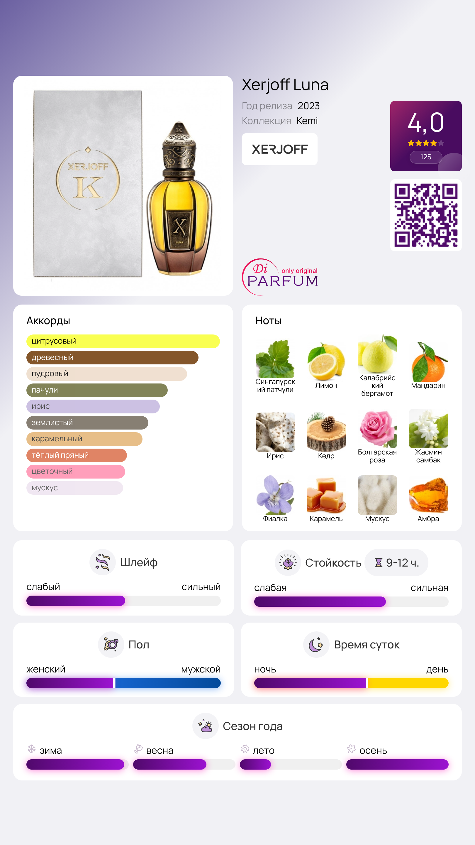 Аромат Xerjoff Luna представляет собой утончённую цветочную восточную композицию, вдохновленную Луной, самой таинственной из всех небесных объектов. Она манит и завораживает с давних времён, когда алхимики и философы связывали её с серебристым сиянием. Цитрусовая свежесть в этом аромате гармонично дополняется теплыми пряностями.
