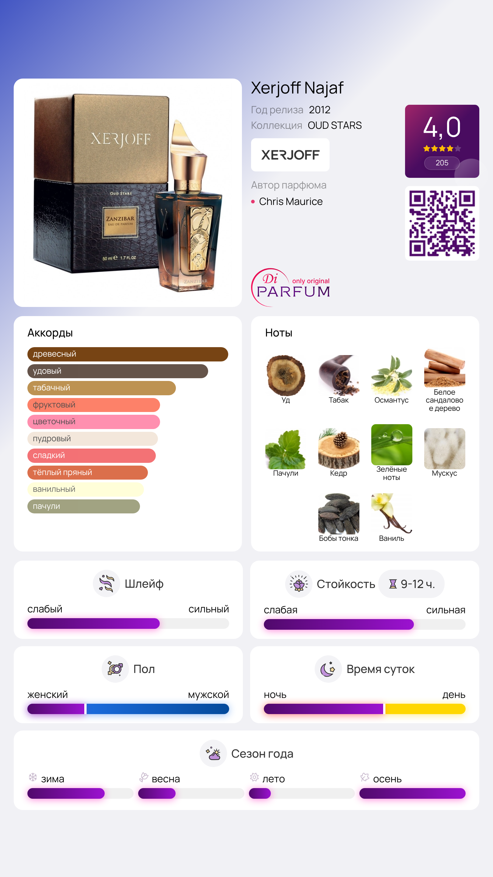 Zanzibar (Najaf) от Xerjoff — это восточно-древесный аромат для женщин и мужчин, который был представлен в 2012 году. Автором этого удивительного парфюма является парфюмер Chris Maurice.