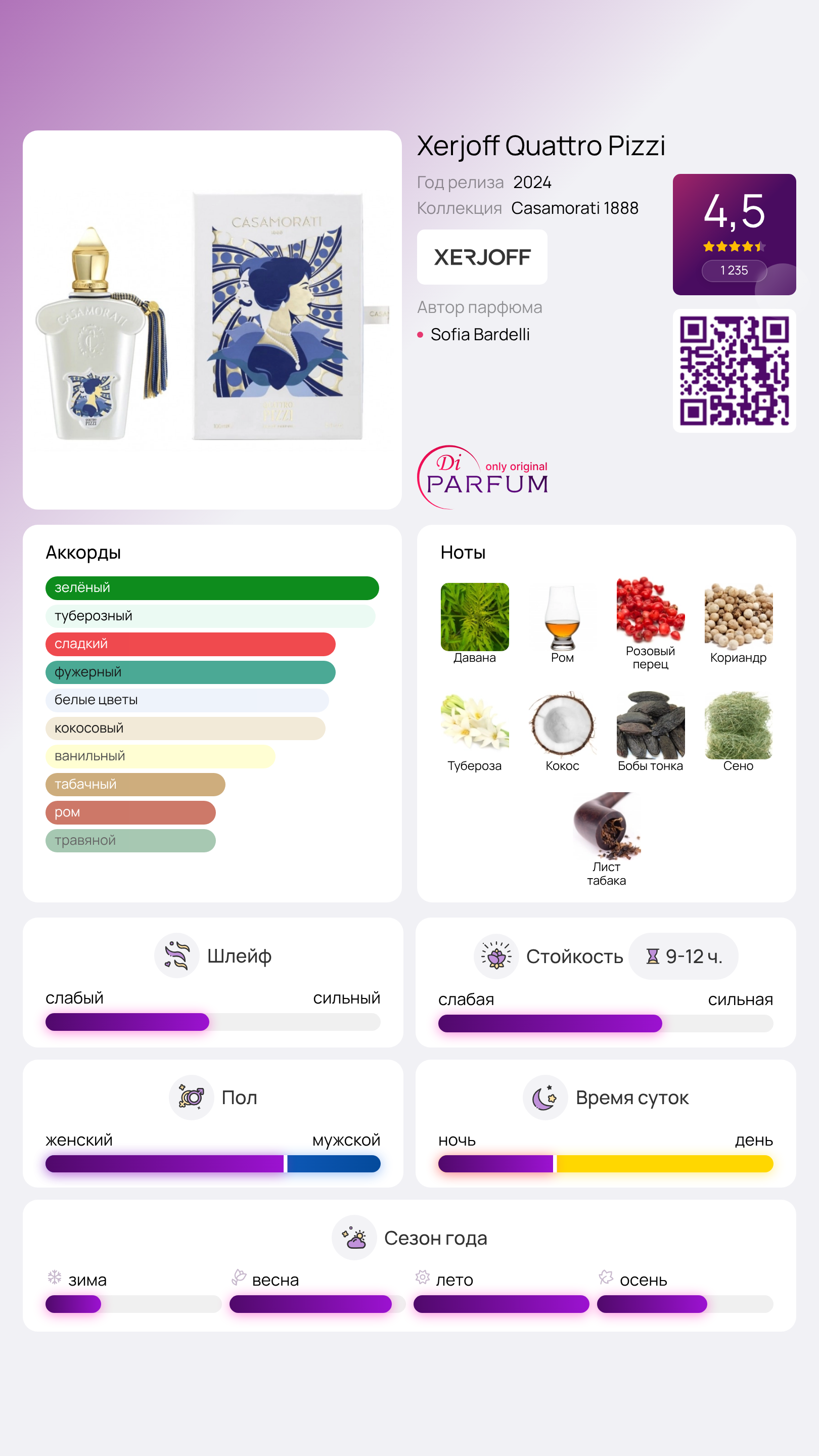 Элегантная композиция Quattro Pizzi от Xerjoff, изданная в 2024 году в линии Casamorati, символизирует страстные эмоции на фоне живописной Сицилии. Флакон, окрашенный в молочный цвет, отражает теплое и чистое настроение южной страны.
