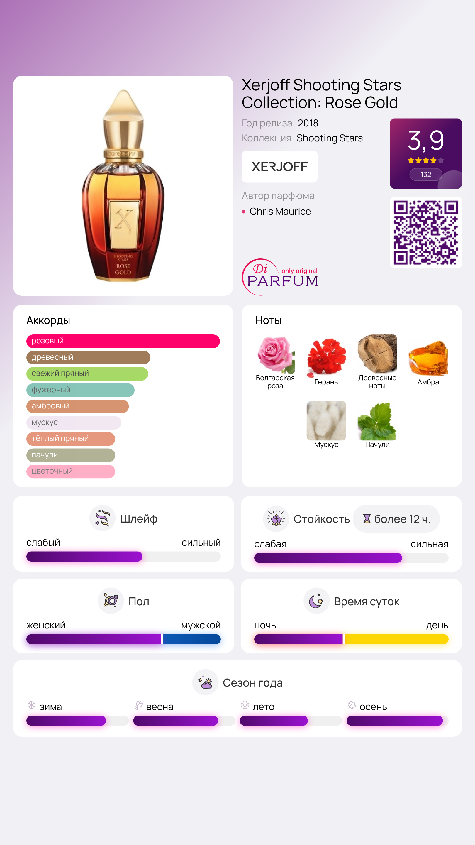 Аромат не затихает, а лишь становится более загадочным, обнимая ноты египетской герани и мистической древесины священного дерева Будды. По мере завершения пирамиды Rose Gold из коллекции Xerjoff Shooting Stars, королева цветов раскрывается еще грациознее, наполняясь теплотой сандала, пряностями пачули и соблазнительными каплями мускуса.