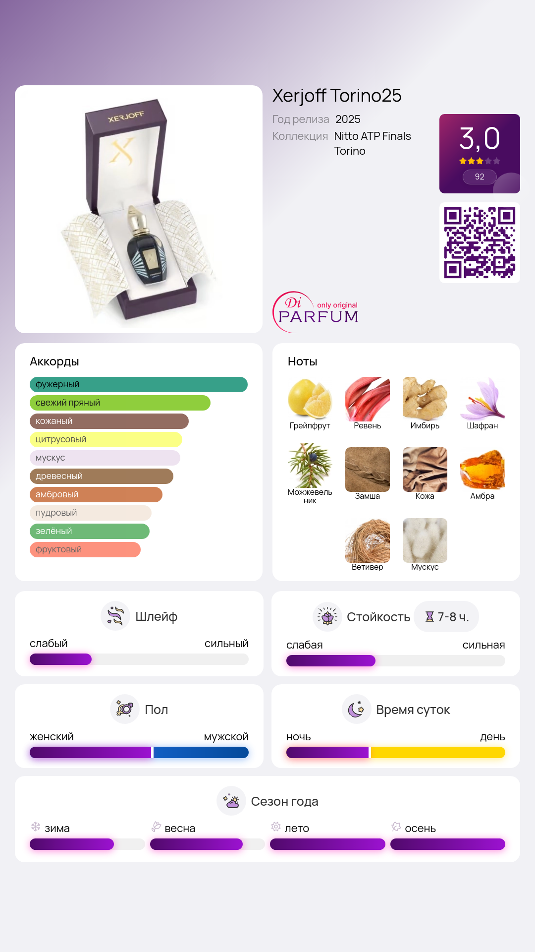 Torino25 доступен в формате 50 мл парфюма и порадует любителей пряных, кожаных и древесных ароматов своим сложным и многослойным характером.