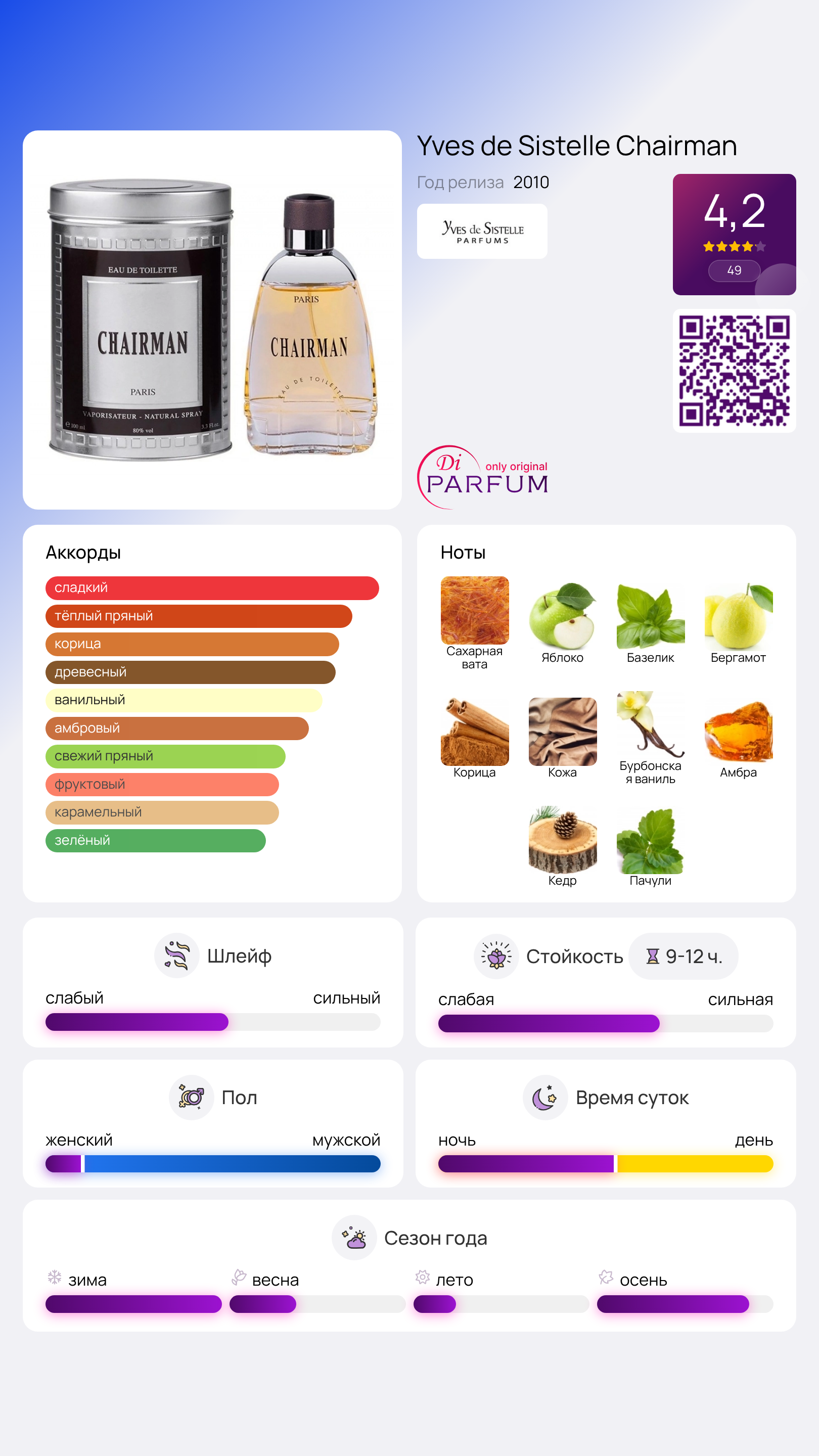 Парфюмерная композиция Yves de Sistelle Chairman представляет собой элегантный пряный древесный аромат, который несет в себе дух лучших французских парфюмерных практик. Этот новый фланкер основан на предыдущем издании Chairman и отличается широким спектром свежих фруктов, ароматных специй и оптимистичного настроения.