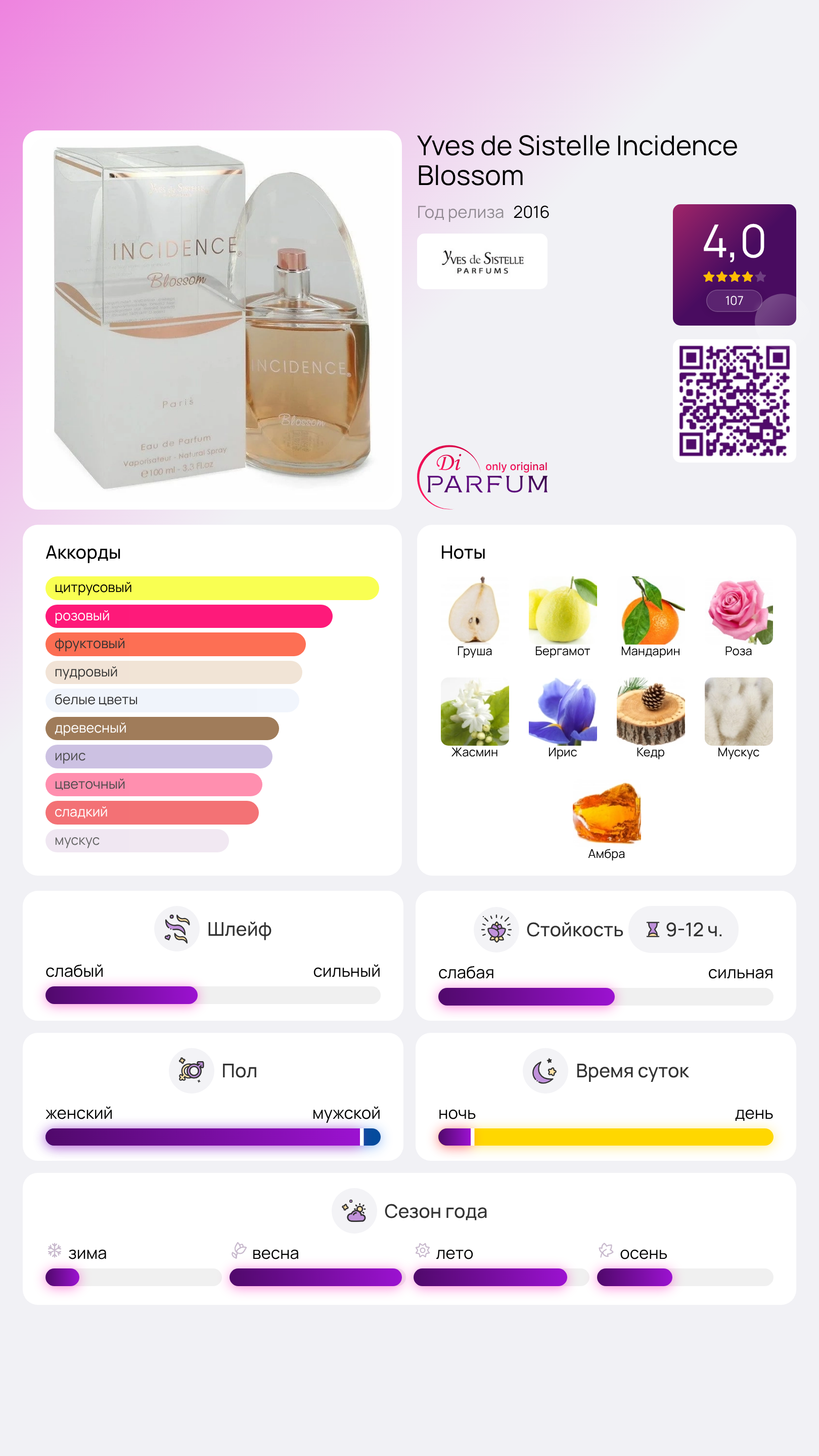 Элегантная цветочно-фруктовая композиция Yves de Sistelle Incidence Blossom олицетворяет современный французский аромат. Этот парфюм наполнен радостью жизни и предлагает удивительное сочетание запахов, скрытое за своей кажущейся простотой.
