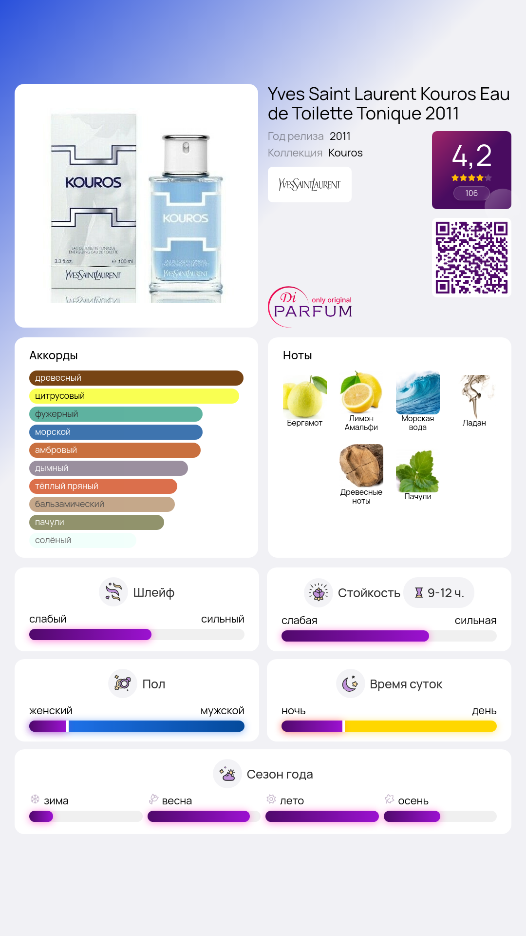 Сердце аромата усиливает это тонизирующее начало прохладными и слегка солеными морскими аккордами. Мужская природа парфюма подчеркивается богатой базой, в которую входят листья пачули, дымный ладан и мягкий древесный оттенок. Это гармоничное сочетание различных ароматов сделало Yves Saint Laurent Kouros Eau de Toilette Tonique 2011 одним из самых востребованных парфюмов бренда на протяжении почти десяти лет.