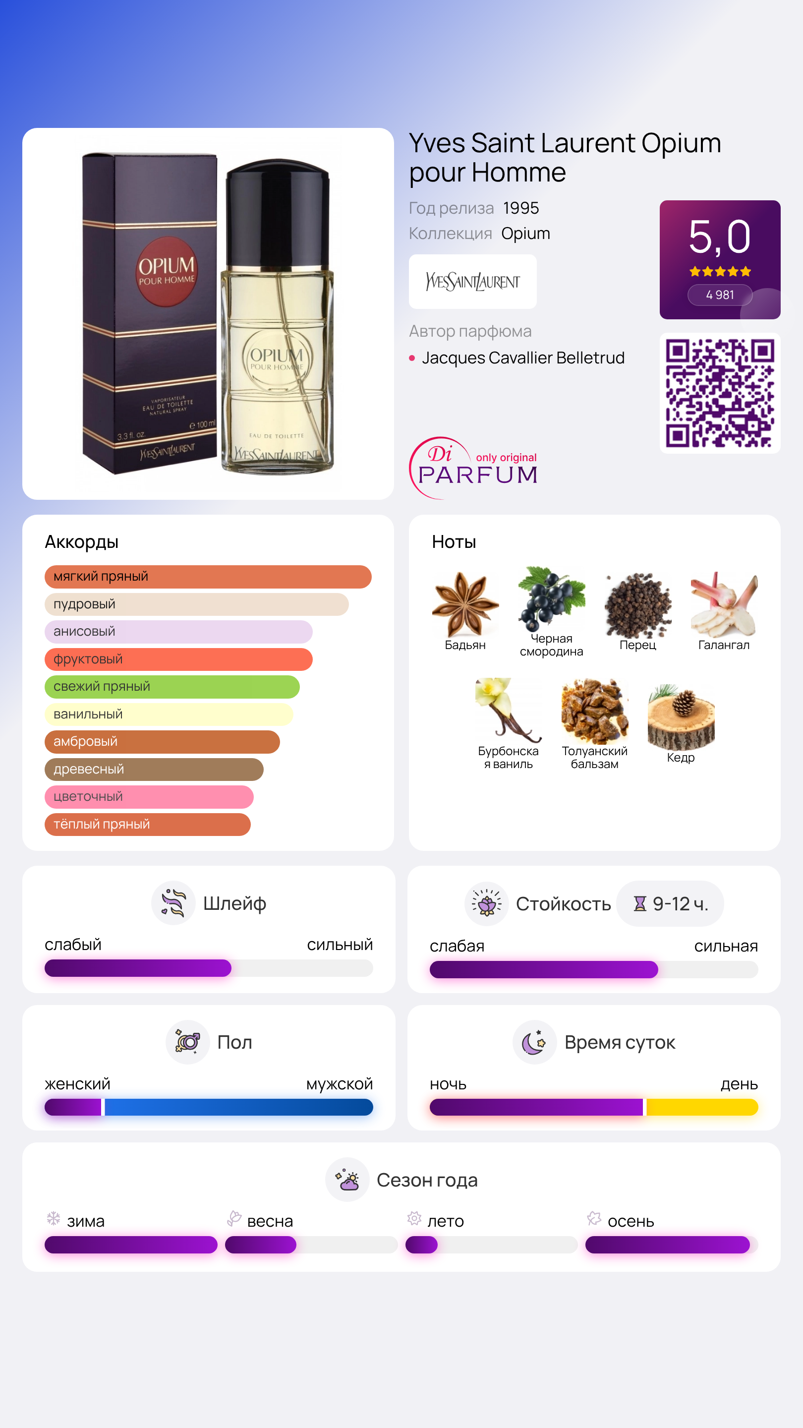 Yves Saint Laurent Opium pour Homme был создан для мужчин, которые предпочитают строгий и сдержанный классический стиль. Этот аромат подойдет для театральных выходов, светских раутов или торжественных мероприятий. Он может показаться слишком тяжелым для романтических свиданий и повседневных образов, если только владелец не носит строгий костюм в привычном стиле.