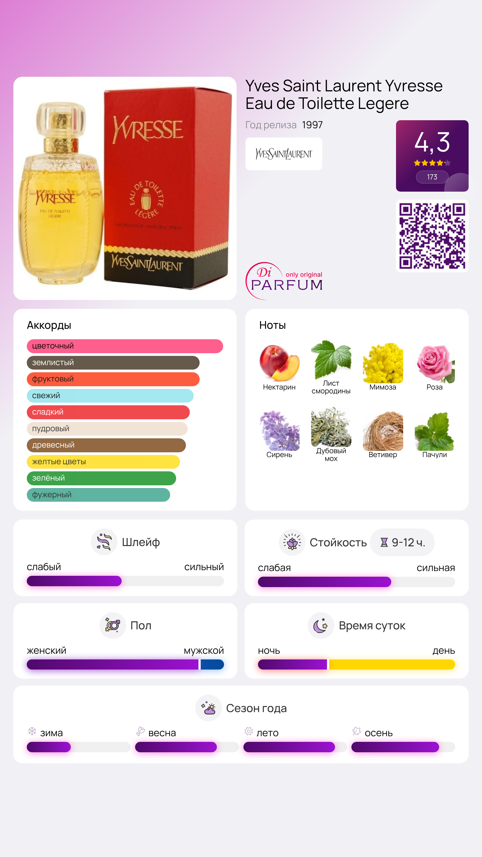 Каждая эпоха обладает своим уникальным стилем, а 90-е годы стали периодом смелых нововведений и ярких ароматов на парфюмерном рынке. Примером такой смелости является композиция Yvresse Eau de Toilette Legere от знаменитого модельера Yves Saint Laurent. Этот шипрово-цветочный аромат, выпущенный в 1997 году, пришелся по душе многим благодаря своему сладкому началу с нот нектарина и смородиновых листьев.