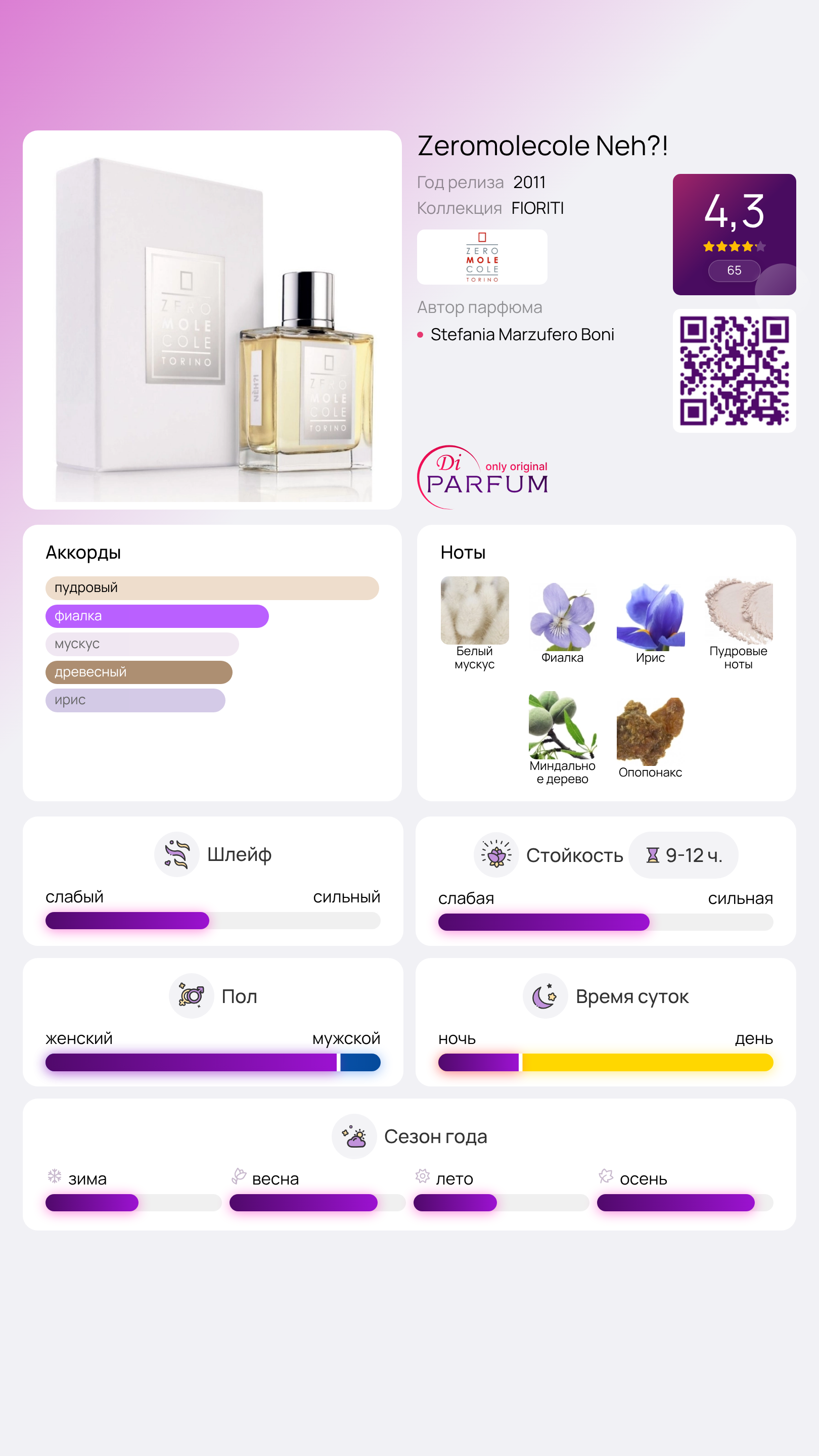 Аромат Nèh сочетает в себе мягкие пудровые и цветочные ноты, создавая атмосферу тепла и комфорта. В его сердцевине находятся ноты ириса и фиалки, которые придают аромату шикарный и изысканный шарм. Опопонакс добавляет глубину, в то время как белый мускус и пудровые нотки придают сладость и нежность.