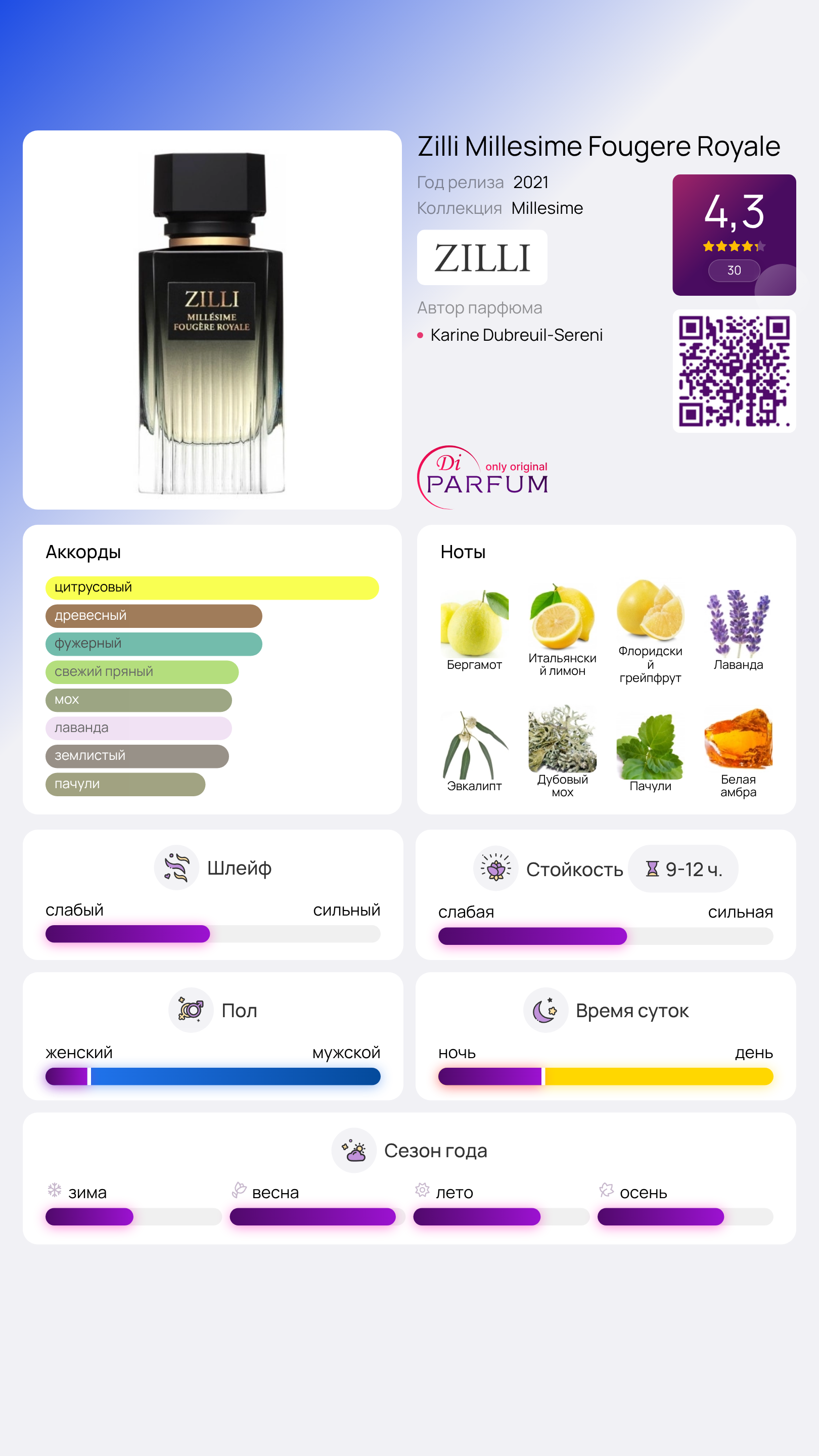 Аромат Millesime Fougere Royale от Zilli был представлен в 2021 году в рамках «трио» совместных творений с известной парижской компанией. Он стал частью второй коллекции бренда и идеально подходит для любого времени суток. Элегантный темный флакон с рифленой структурой украшен золотистыми элементами, а внутри находится жидкость пепельного цвета. Упаковка открывается, как театральный занавес, создавая особую атмосферу.
