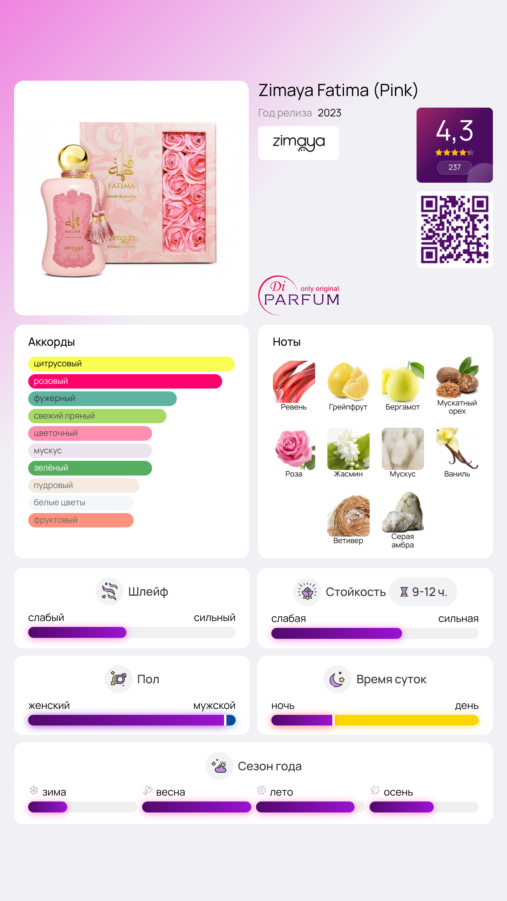 С ароматом Zimaya Fatima (Pink) любой образ приобретает особое очарование и женственность, достаточно всего лишь нескольких капель, чтобы создать устойчивый шлейф, который будет привлекать внимание.