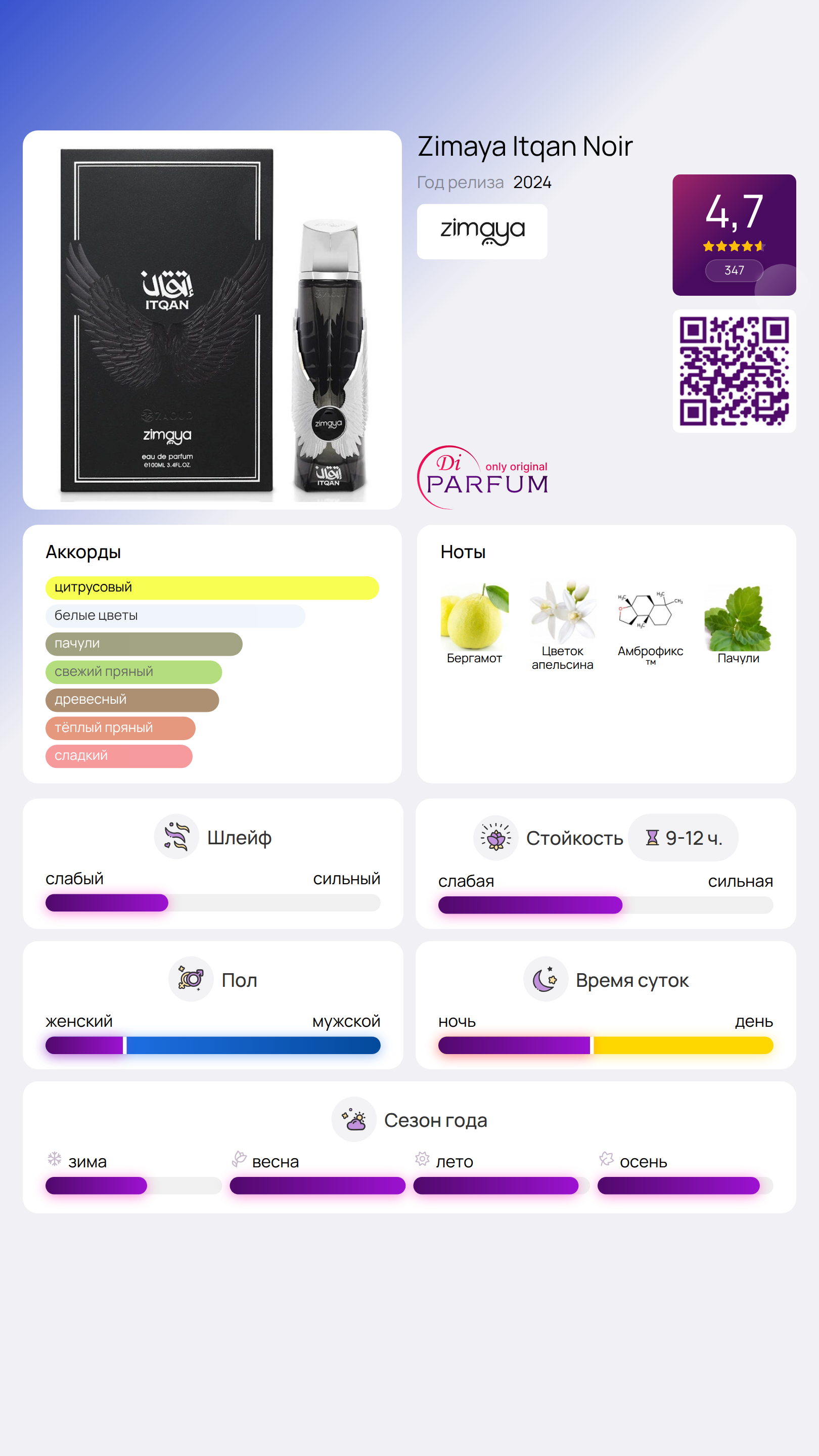 Itqan Noir от Zimaya — это восточно-цветочный аромат, созданный как для женщин, так и для мужчин. Этот новый парфюм был представлен в 2024 году. За его создание отвечает парфюмер Имран Фазлани.