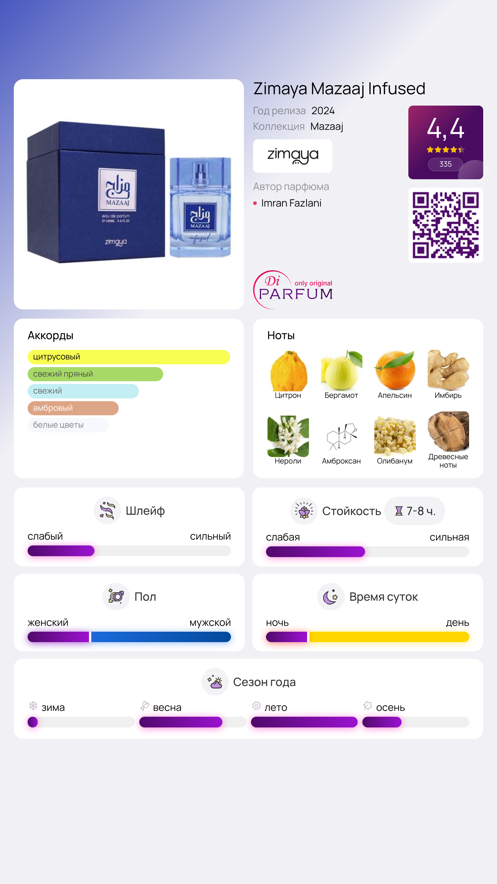 Парфюм, входящий в цитрусовую и фужерную семьи, представляет собой неповторимое сочетание свежести и утонченности. Его верхние ноты из цитрона, бергамота и апельсина создают яркий и солнечный аромат, который моментально поднимает настроение. Сложные акценты имбиря и нероли добавляют элегантности и загадочности.