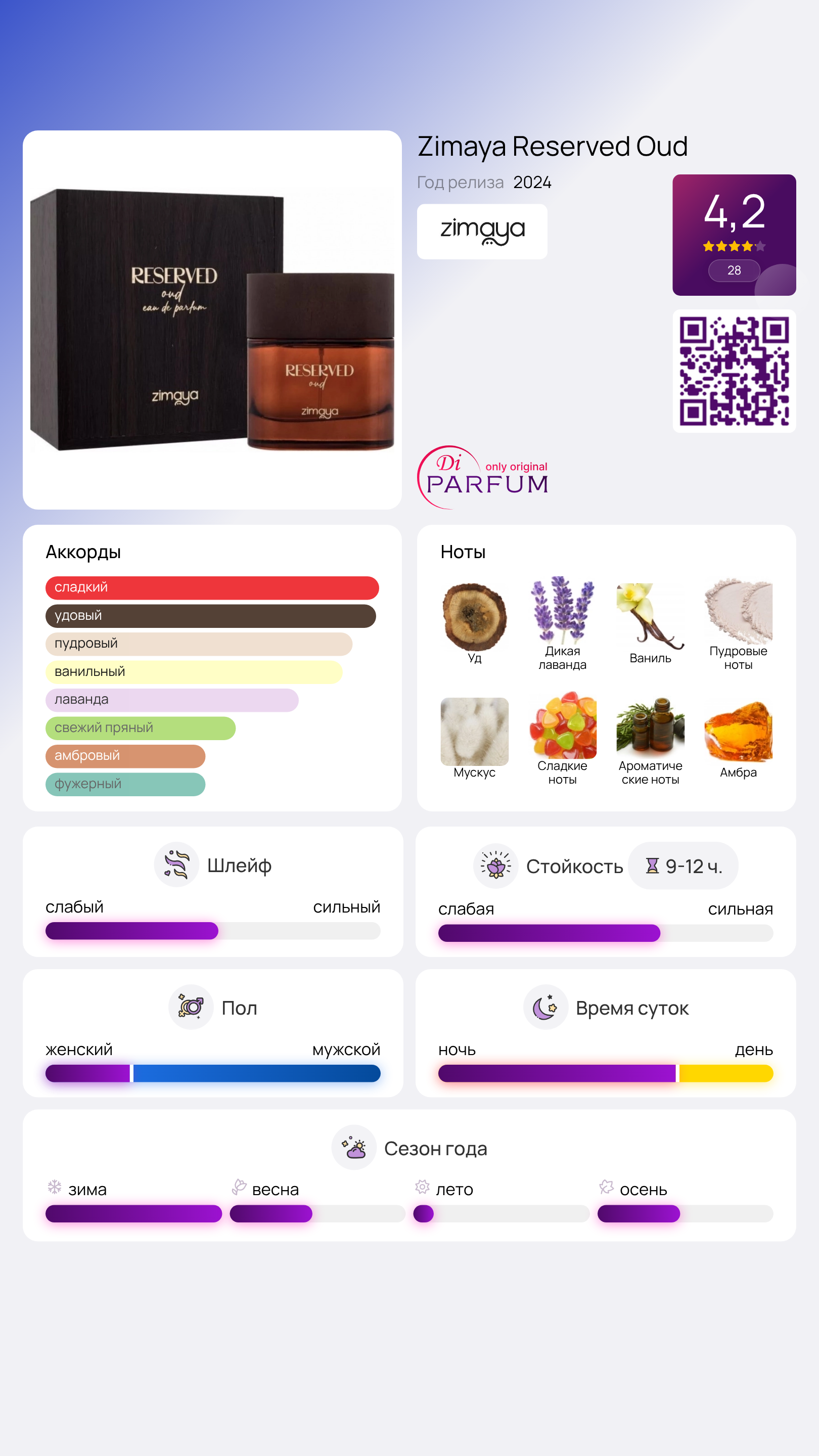 Reserved Oud – это унисекс Eau de Parfum, создающий впечатление уверенности и элегантности. Этот аромат идеально подходит как для повседневного использования, так и для особых случаев, благодаря своей многогранной структуре и универсальности. Позвольте себе погрузиться в мир роскоши и нежности с Reserved Oud от Zimaya.