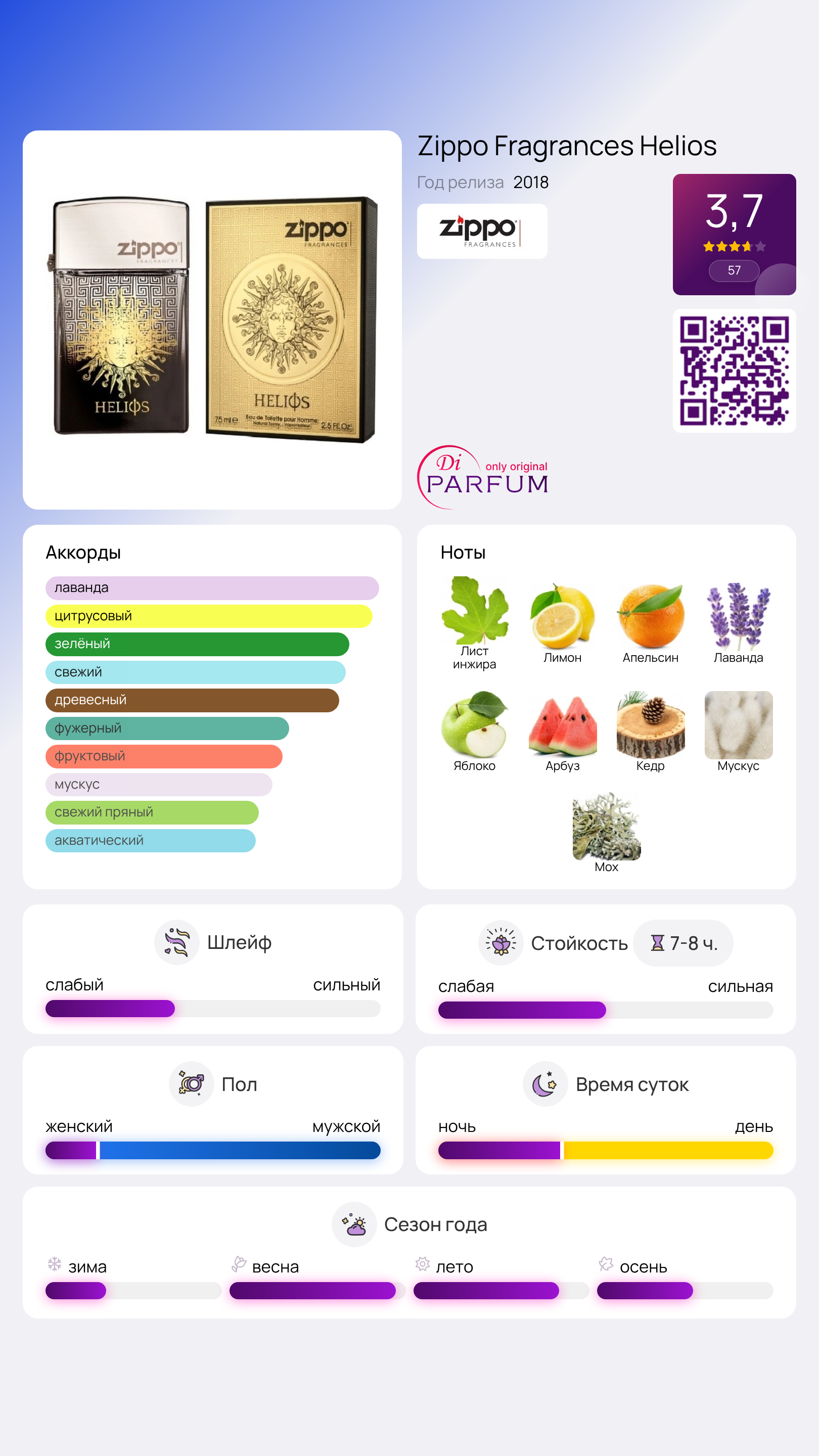 Тонизирующее яблоко соперничает с прозрачным, водянистым арбузом, но все аккорды прекрасно сбалансированы. Финальную ноту композиции Helios от Zippo Fragrances звучит кедр — король древесных ароматов. Его свежий, хвойный аромат мягко переплетается с земляным, лесным мхом, что улучшает стойкость шлейфа. Пудровый и кожаный мускус объединяет все ноты в волнующее и гипнотическое восприятие, делая этот аромат покорителем женских сердец.