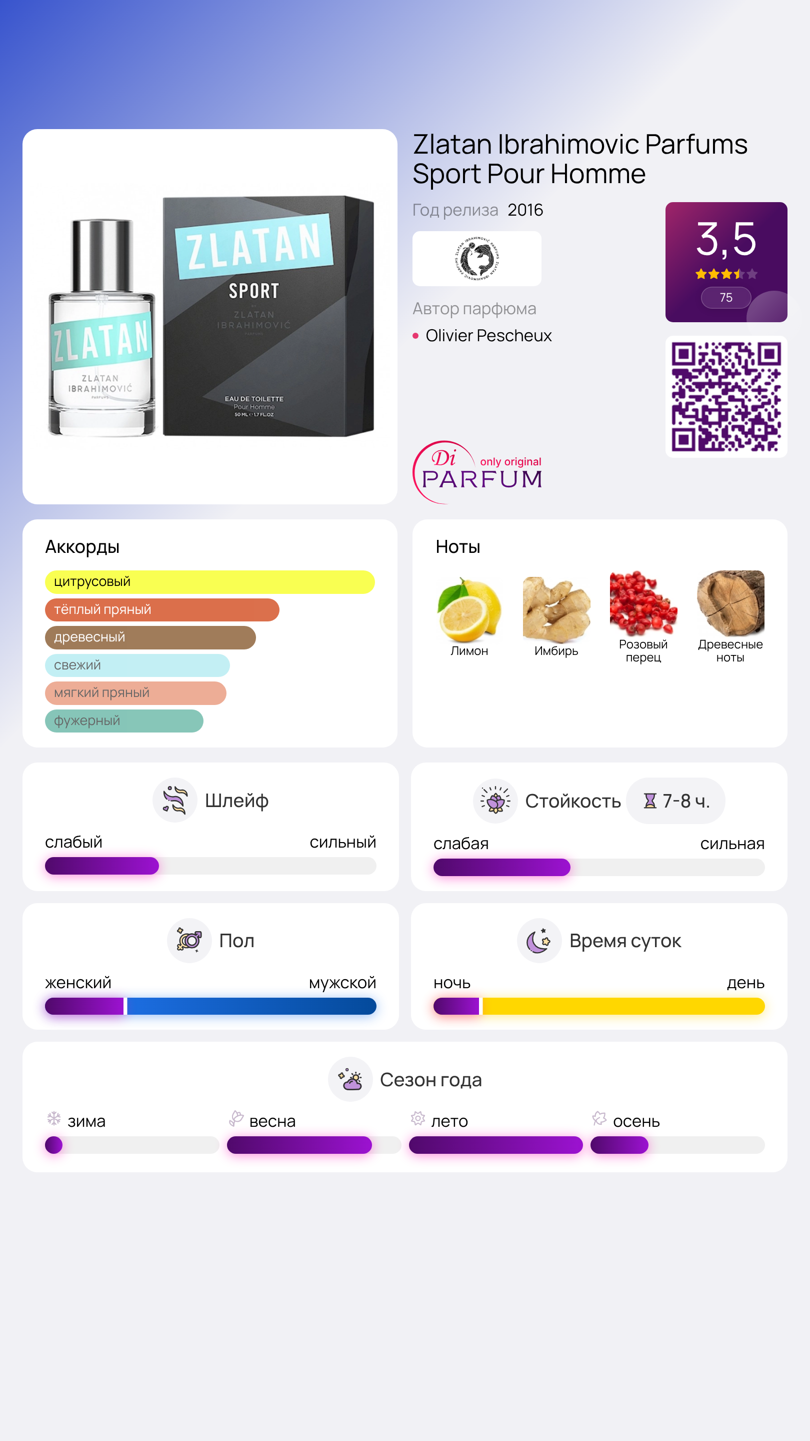 Сердцевина аромата наполнена игривыми цветочными нотами с легким яблочным оттенком. В базе раскрываются дымчатая древесная основа и завораживающий мускус, обладающий деликатными острыми чертами. Мужской эликсир Sport Pour Homme от Zlatan Ibrahimovic Parfums представлен в простом и элегантном формате. Прозрачный флакон украшен эмблемой бренда и именем своего вдохновителя, на которого ориентирована данная ароматическая композиция.