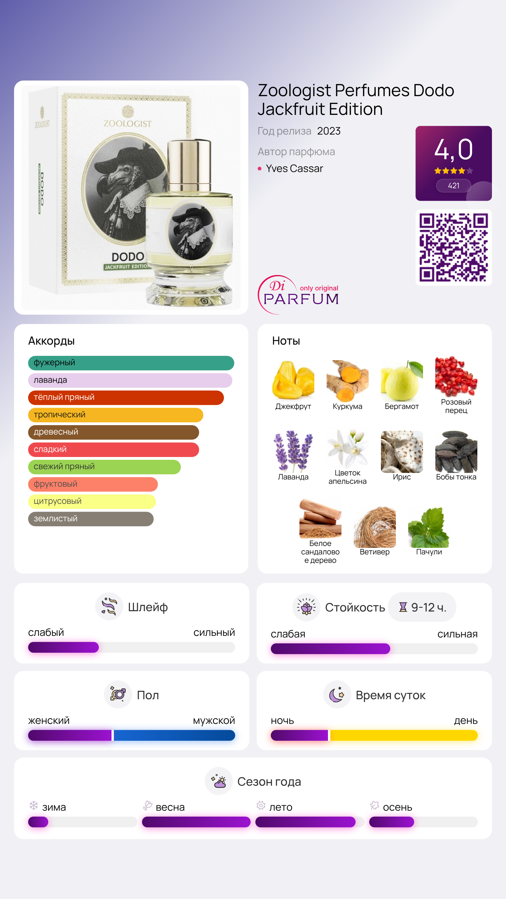 Аромат относится к категориям фужерных, фруктовых и пряных композиций. Искрящиеся ноты джекфрута и бергамота в сочетании с травяными и цветочными акцентами делают его идеальным выбором как для повседневного использования, так и для особых случаев. Подчеркните свою индивидуальность и неповторимость с Dodo Jackfruit Edition и окунитесь в мир незабываемых эмоций и впечатлений!
