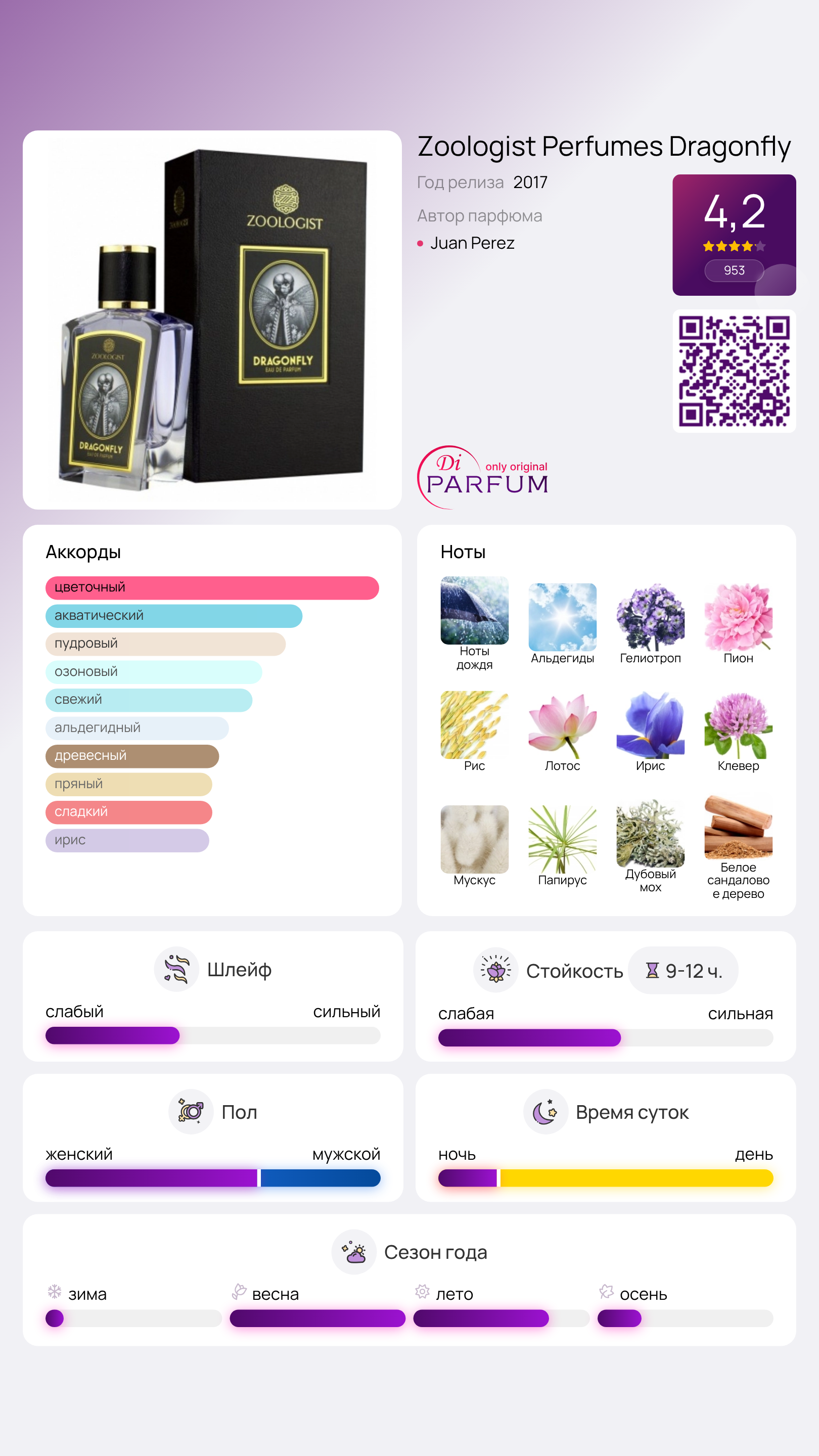 Dragonfly от Zoologist Perfumes — это шипрово-цветочный аромат, который подходит как женщинам, так и мужчинам. Запущенный в 2017 году, этот уникальный парфюм создан парфюмером Хуаном Пересом. Dragonfly выделяется своим оригинальным сочетанием свежести и нежности, что делает его идеальным выбором для любых случаев.