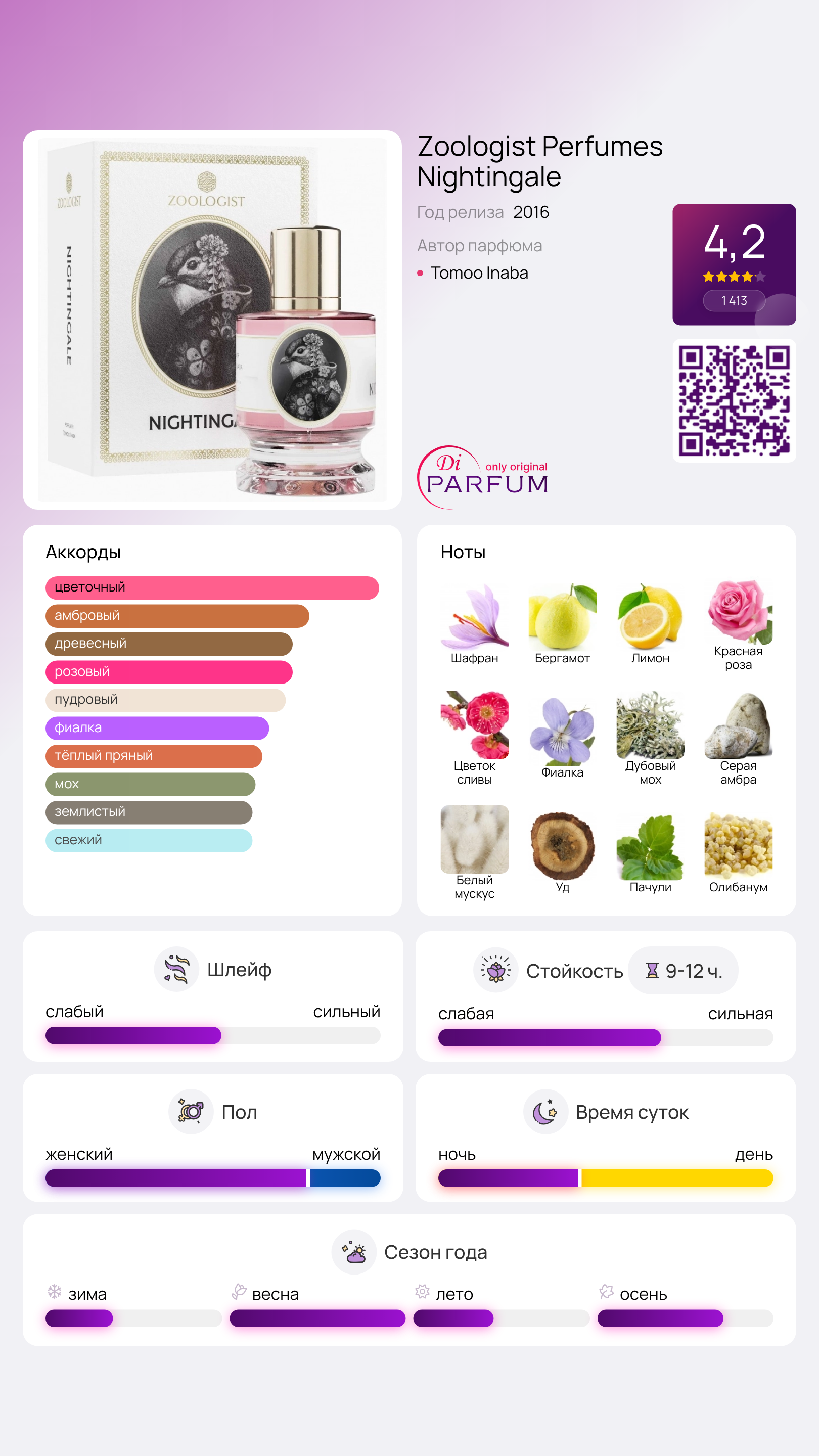 Nightingale – это аромат для тех, кто ценит уникальность и не боится выделяться. Он идеально подходит для вечерних выходов и особых случаев, оставляя за собой шлейф загадочности и изыска.