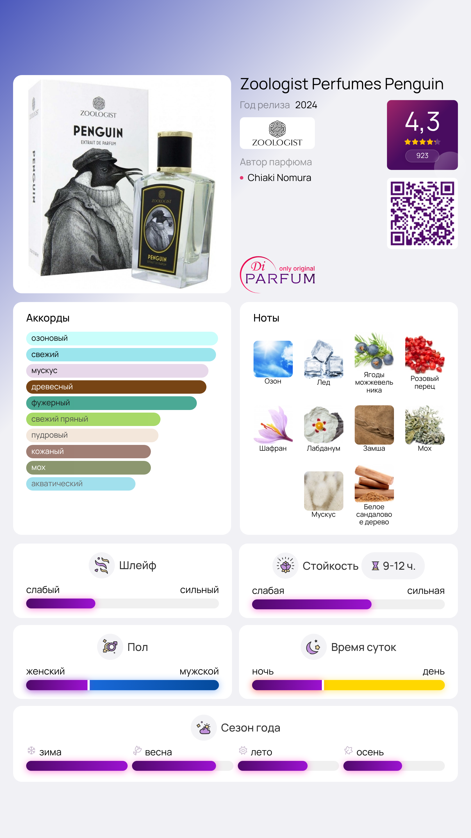 В сердце аромата раскрываются теплые пряные и смолистые аккорды розового перца, шафрана и лабданума — долгожданное тепло после ледяного дуновения. Завершают эту контрастную симфонию мягкие, благородные, бархатистые и чувственные ноты замши, мускуса, сандала и мха. Zoologist Perfumes Penguin – это воплощение северного очарования, это наиболее реалистичное ощущение холодного снега, который начинает таять на теплой коже.