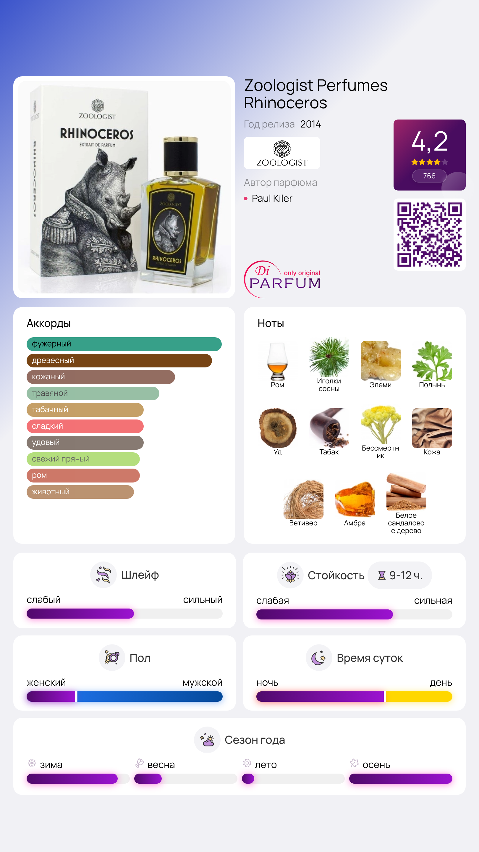 Парфюмер Paul Kiler продемонстрировал свое высокое мастерство и способность визуализировать флору и фауну в своем аромате Zoologist Perfumes Rhinoceros. Как вы представляете запах мощного носорога с его угрозающим рогом, грубой и толстой кожей? Первые ассоциации могут вызвать образ зоопарка и пыли. Такие "животные" нотки часто не раскрываются должным образом, превращаясь в удушающие, навязчивые или даже неприятные ароматы. Однако в данном случае все иначе.