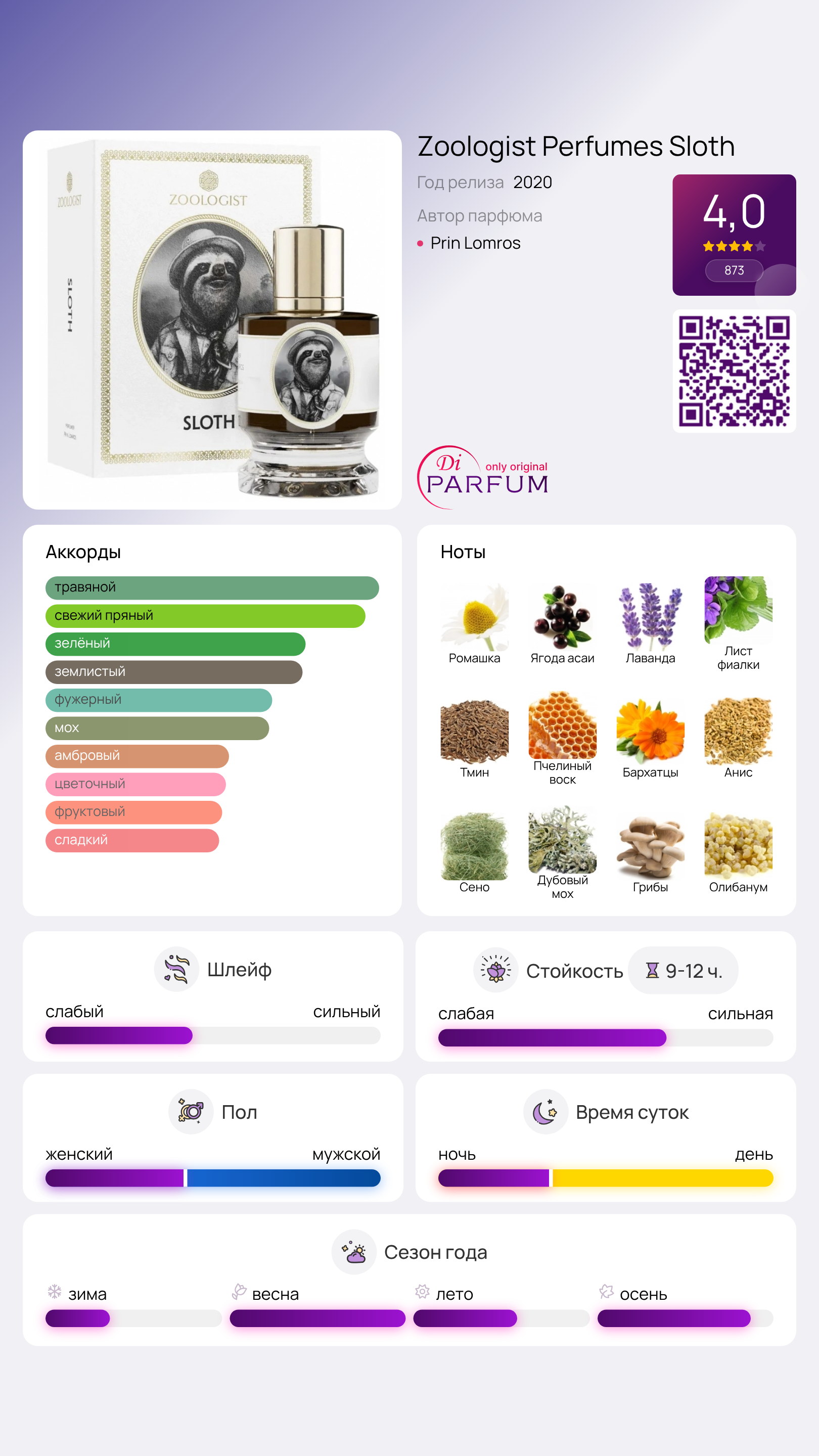 Sloth идеально подходит для тех, кто ищет гармонию и умиротворение в парфюмерии. Этот аромат станет великолепным выбором для повседневного использования и специальных случаев, позволяя вам ощутить легкость и расслабление в любой обстановке.